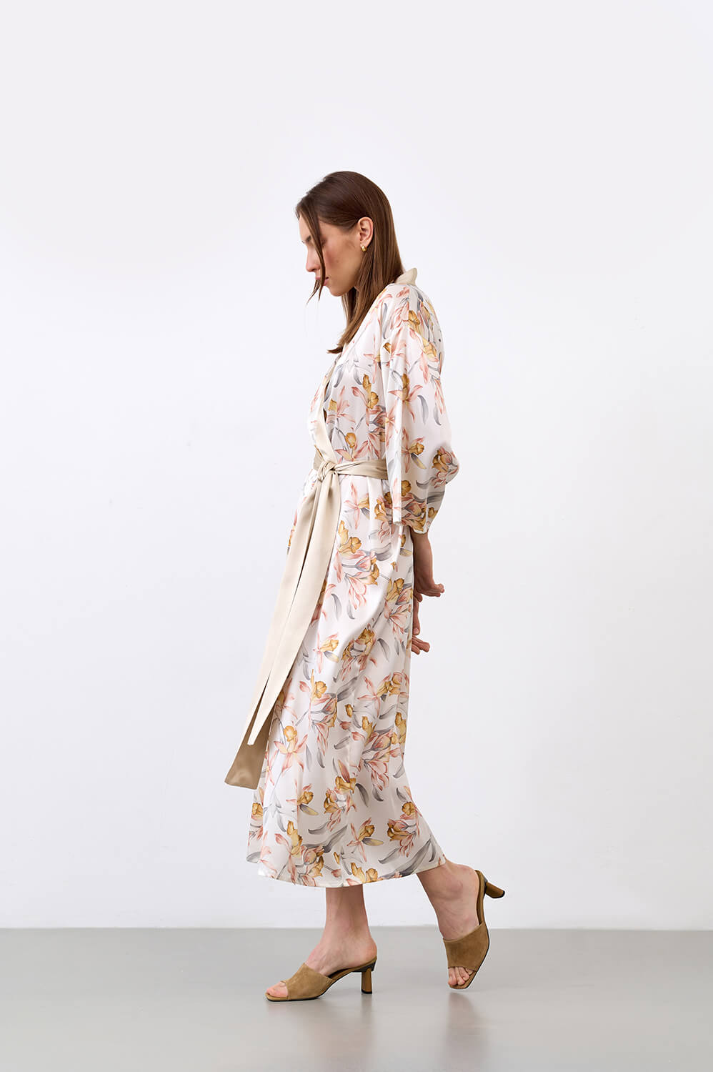 Длинный халат-кимоно с растительным принтом из премиальной коллекции Pijama Story Exclusive. Кимоно выполнено полностью закрытыми швами с изнаночной стороны ювелирным люксовым шитьем. Натуральный шелк Mulberry обладает прочным плетением и гипоаллергенными свойствами, что делает ее исключительно мягкой и чувственной. Эта модель прекрасно подойдет не только для дома, но и для пляжного отдыха. Сделано в России. Параметры модели: рост 176 см, объем груди 85 см, талии 63 см, бедер 94 см. Доступен к заказу только при 100% оплате