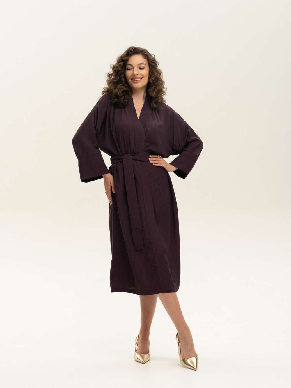 Халат-кимоно из вискозы жаккардовго плетения с мелким принтом.. Выполнен цвете спелого винограда в длине миди, с широким поясом. Ткань имеет удивительную нежную нестандартную фактуру. Невероятно струящаяся вискоза с благородным переливом, которая не электризуется . Легкая, хорошо драпируется, дышит. Идеально для дома и пляжа и как дополнение расслабленного образа в городе и путешествиях. Сделано в России. Параметры модели: рост 175, 88-60-90