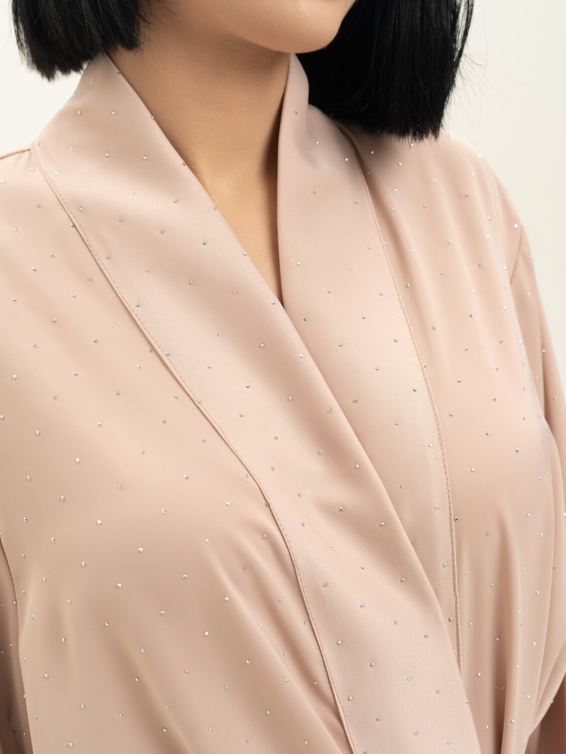 Халат-кимоно из лимитированной коллекции Pijama Story Exclusive в бежевом цвете выполнен из смесовго шелка со стразами. Будет актуальным для вечеринки или мероприятий всесезонно. Он красивый, элегантный и роскошный, легко сочетается с базовыми предметами гардероба. Сделано в России. Параметры модели : рост 170, 85-62-87