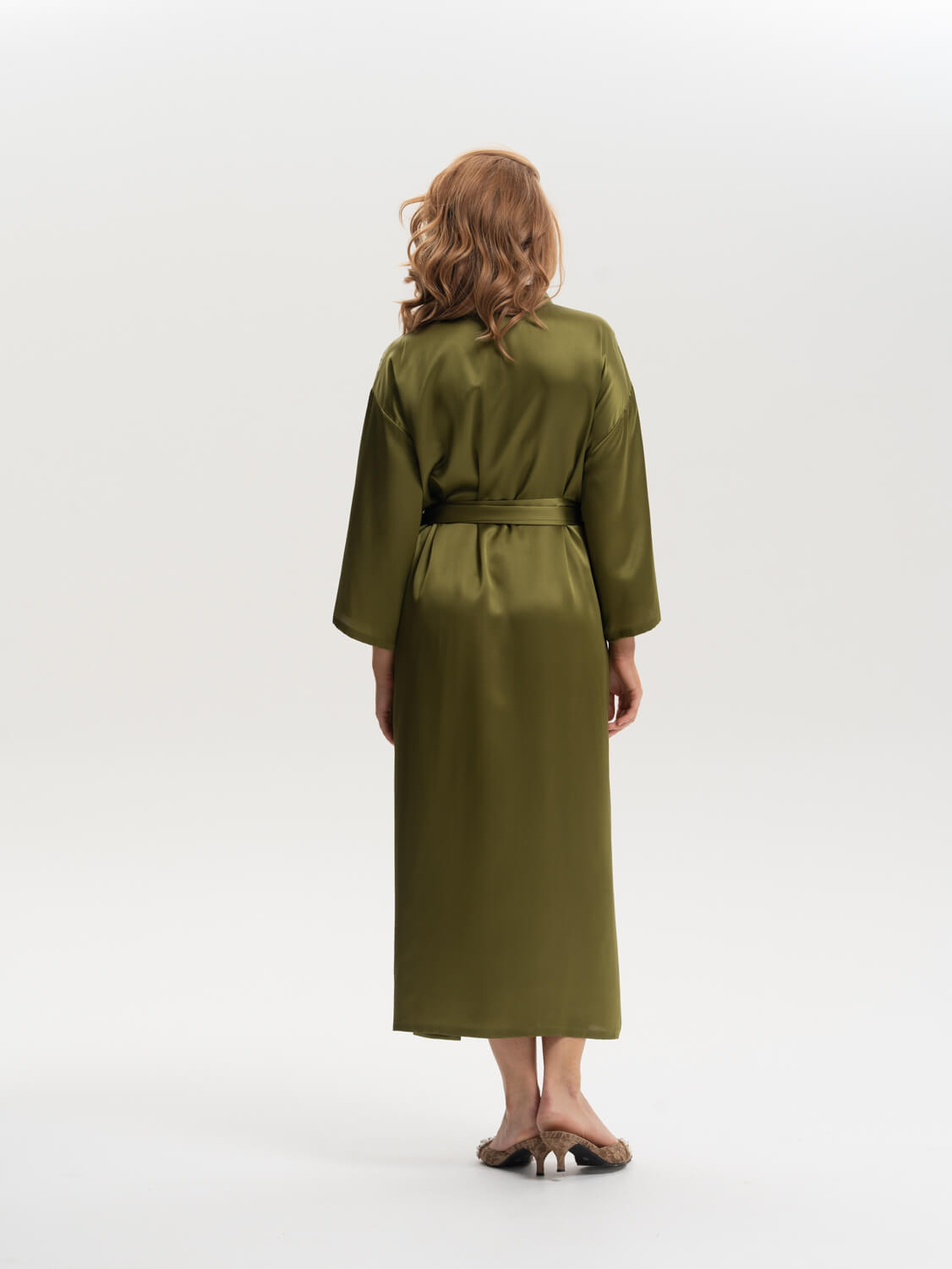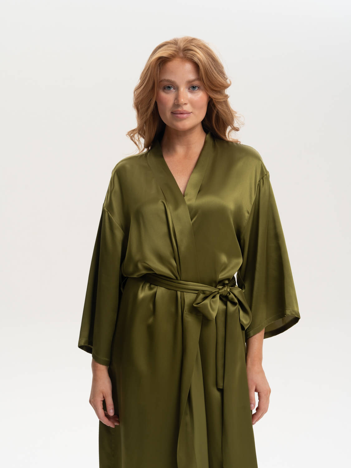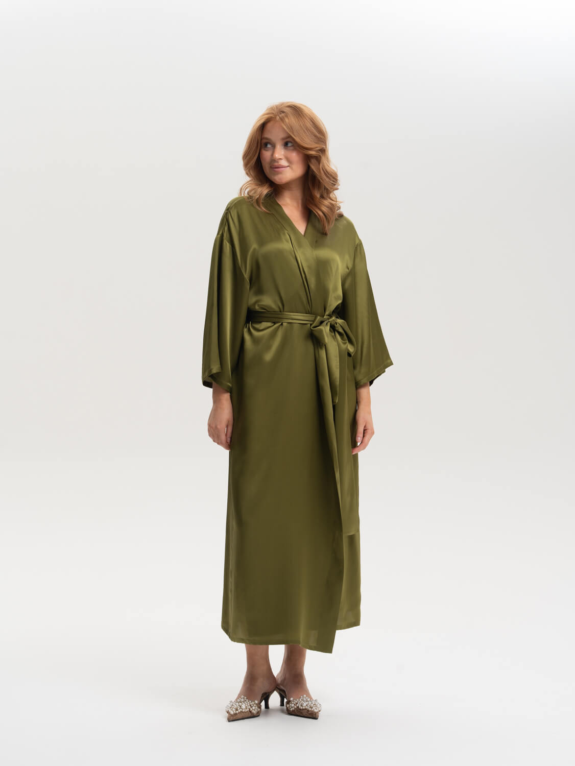 Халат-кимоно с оливковом цвете из премиальной коллекции Pijama Story Exclusive. Кимоно выполнено полностью закрытыми швами с изнаночной стороны ювелирным люксовым шитьем. Натуральный шелк Mulberry обладает прочным плетением и гипоаллергенными свойствами, что делает его исключительно мягким и чувственным. Эта модель прекрасно подойдет не только для дома, но и для пляжного отдыха. Сделано в России. Параметры модели: рост 176 см, объем груди 85 см, талии 63 см, бедер 94 см. Доступно к заказу только при 100% оплате.