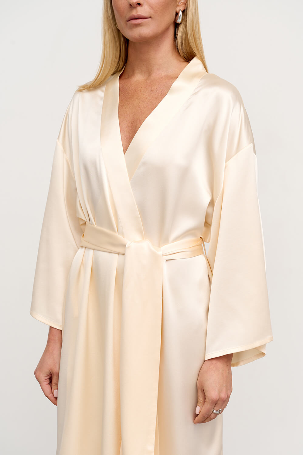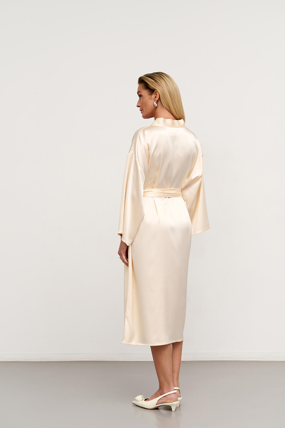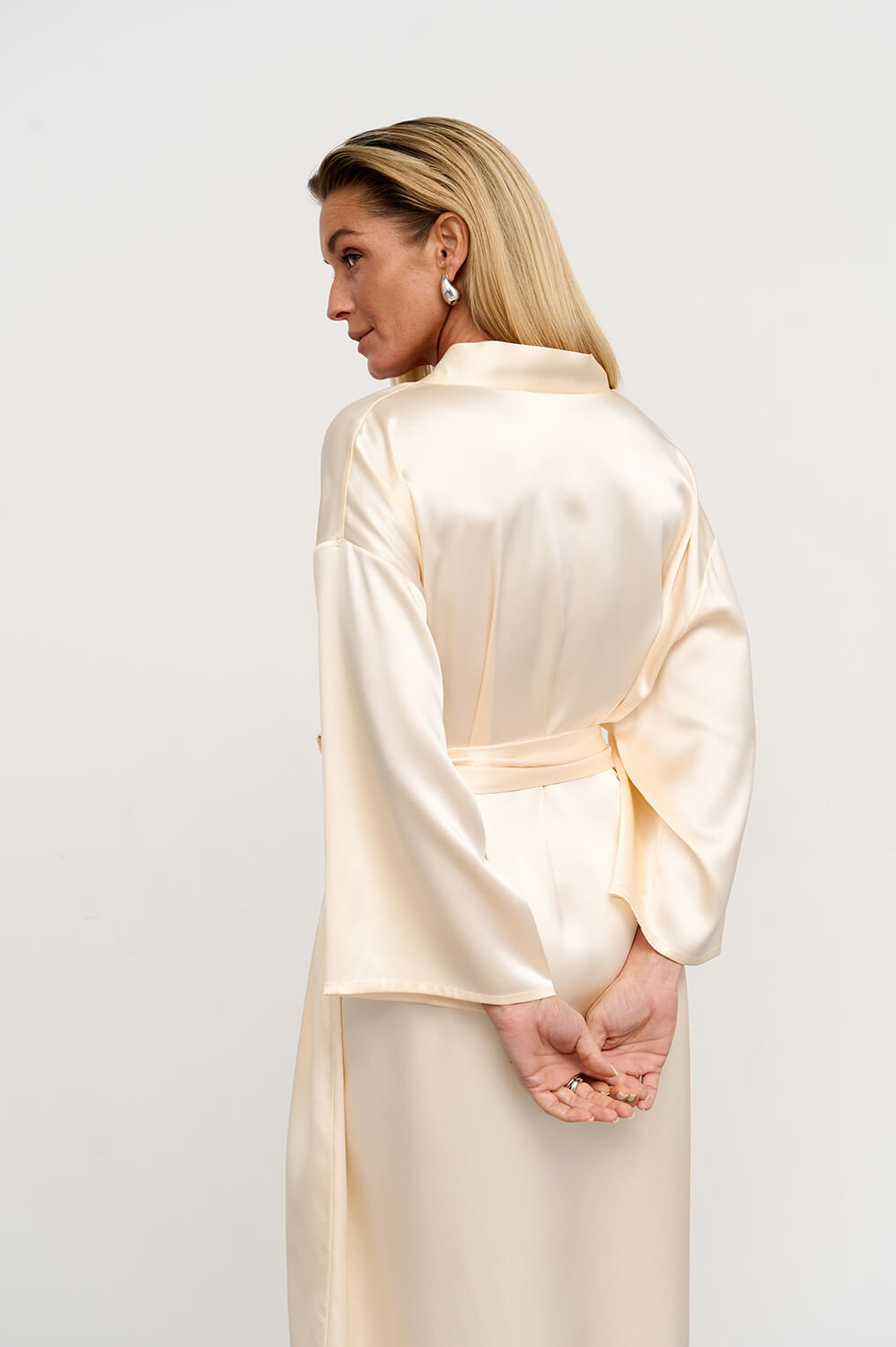 Халат-кимоно в нежно-перламутровом оттенке из премиальной коллекции Pijama Story Exclusive. Кимоно выполнено полностью закрытыми швами с изнаночной стороны ювелирным люксовым шитьем. Натуральный шелк Mulberry обладает прочным плетением и гипоаллергенными свойствами, что делает его исключительно мягким и чувственным. Эта модель прекрасно подойдет не только для дома. Сделано в России. Параметры модели: рост 176 см, объем груди 85 см, талии 63 см, бедер 94 см.