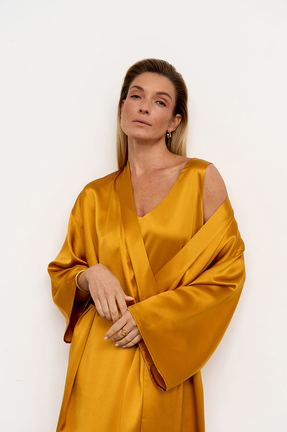 Длинный халат-кимоно в янтарно-медовом оттенке из премиальной коллекции Pijama Story Exclusive. Кимоно выполнено c полностью закрытыми швами с изнаночной стороны ювелирным люксовым шитьем. Натуральный шелк Mulberry обладает прочным плетением и гипоаллергенными свойствами, что делает его исключительно мягким и чувственным. Эта модель прекрасно подойдет не только для дома, но и для пляжного отдыха. Сделано в России. Параметры модели: рост 176 см, объем груди 85 см, талии 63 см, бедер 94 см. Доступно к заказу только при 100% оплате.