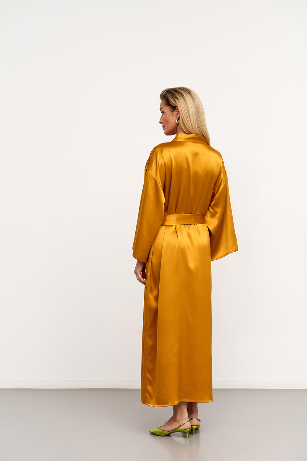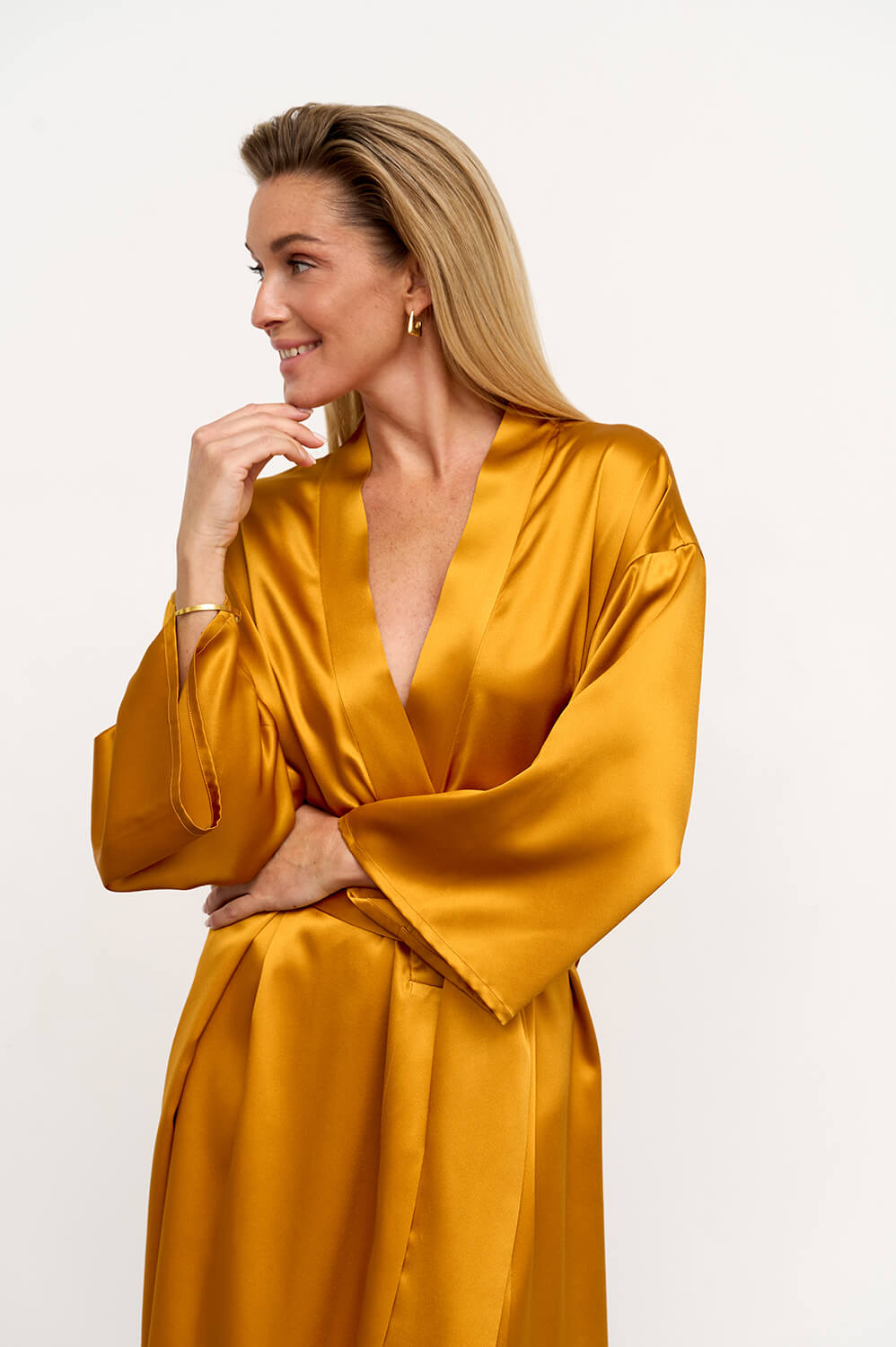 Длинный халат-кимоно в янтарно-медовом оттенке из премиальной коллекции Pijama Story Exclusive. Кимоно выполнено c полностью закрытыми швами с изнаночной стороны ювелирным люксовым шитьем. Натуральный шелк Mulberry обладает прочным плетением и гипоаллергенными свойствами, что делает его исключительно мягким и чувственным. Эта модель прекрасно подойдет не только для дома, но и для пляжного отдыха. Сделано в России. Параметры модели: рост 176 см, объем груди 85 см, талии 63 см, бедер 94 см. Доступно к заказу только при 100% оплате.