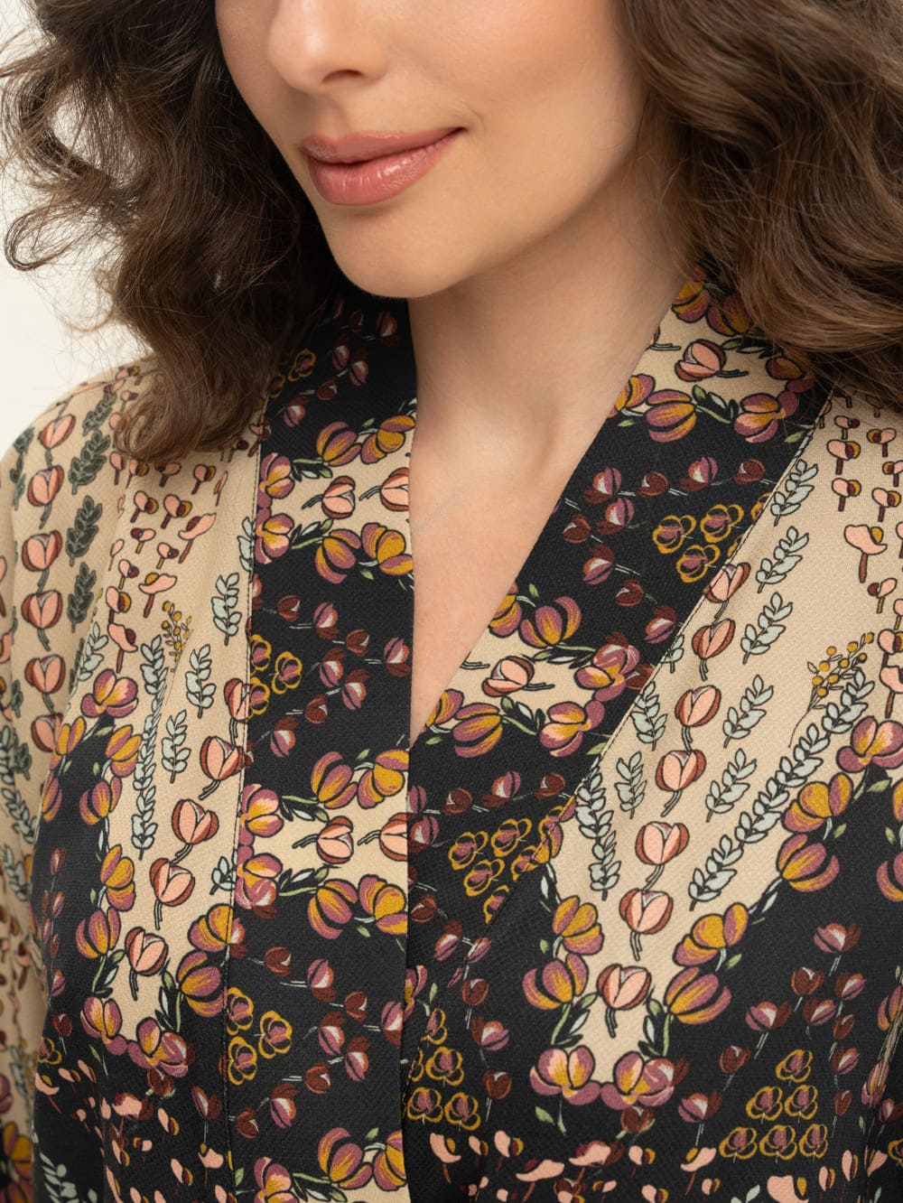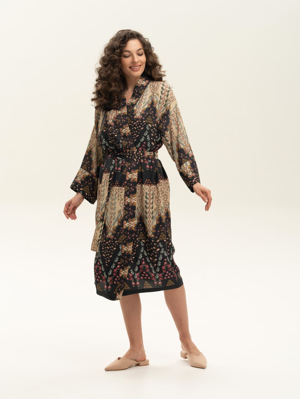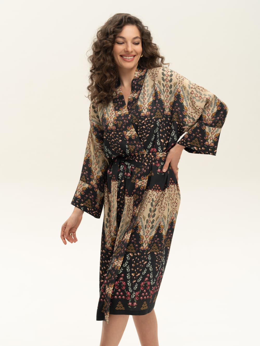 Халат-кимоно из креповой вискозы с необыкновенным принтом. Ткань имеет приятную на ощупь фактуру. Невероятно струящаяся вискоза с матовым эффектом, которая не электризуется . Легкая, хорошо драпируется, дышит. Идеально для дома и пляжа и как дополнение расслабленного образа в городе и путешествиях. Сделано в России. Параметры модели: рост 175, 88-60-90