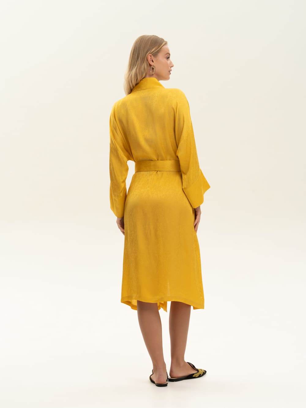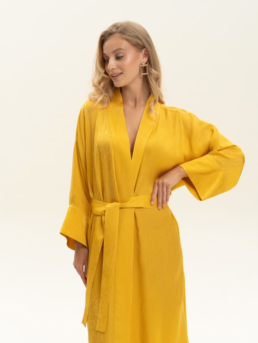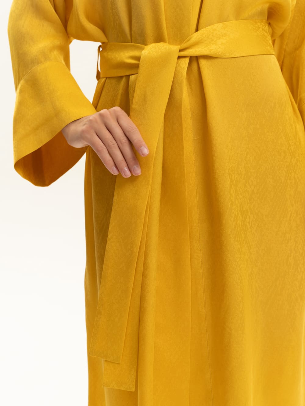 Халат-кимоно из жаккардовой вискозы с мелким принтом "питон" . Выполнен в солнечном цвете в длине миди, с широким поясом. Ткань имеет удивительную нежную нестандартную фактуру. Невероятно струящаяся вискоза с благородным переливом, которая не электризуется . Легкая, хорошо драпируется, дышит. Идеально для дома и пляжа и как дополнение расслабленного образа в городе и путешествиях. Сделано в России. Параметры модели: рост 175, 88-60-90