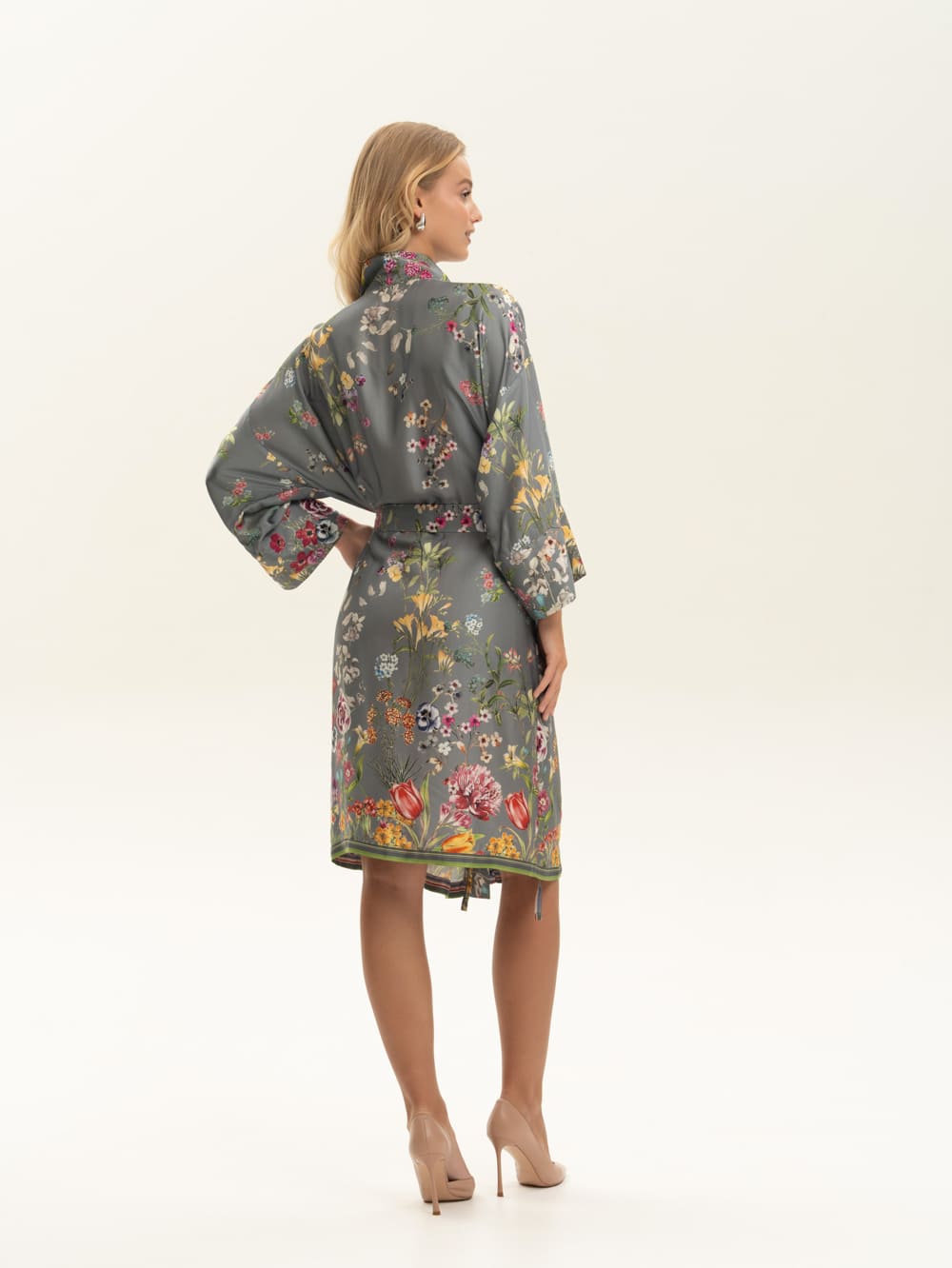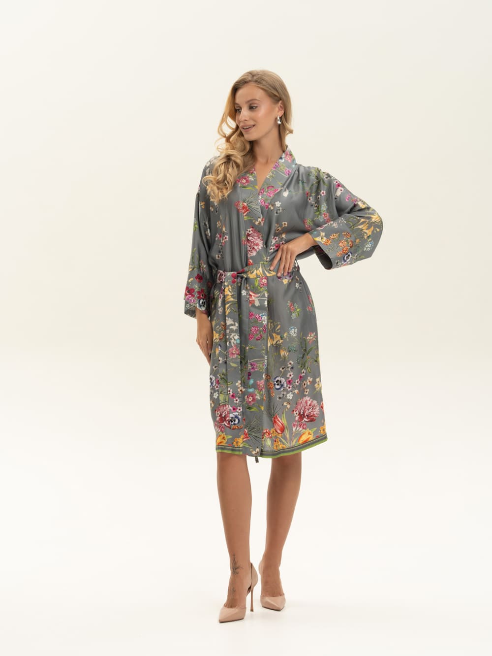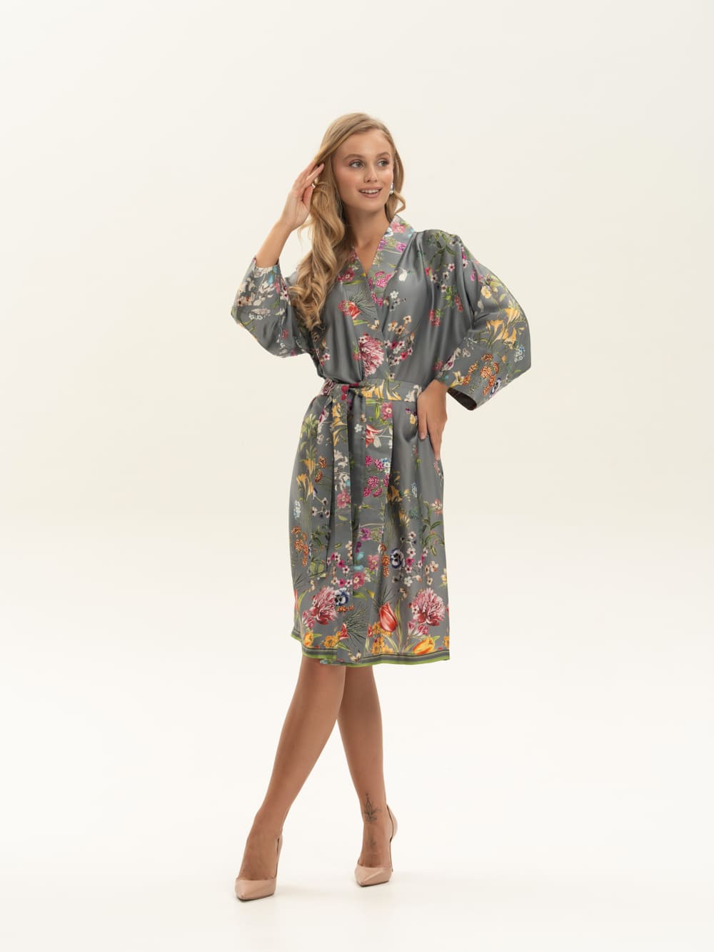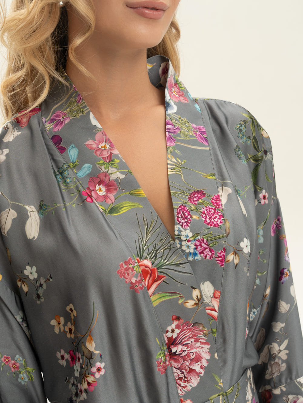 Халат-кимоно из нежной атласной вискозы с флористичным принтом. Ткань имеет приятную на ощупь фактуру. Невероятно струящаяся вискоза с деликатным глянцем, которая не электризуется . Легкая, хорошо драпируется, дышит. Идеально для дома и пляжа и как дополнение расслабленного образа в городе и путешествиях. Сделано в России. Параметры модели: рост 175, 88-60-90