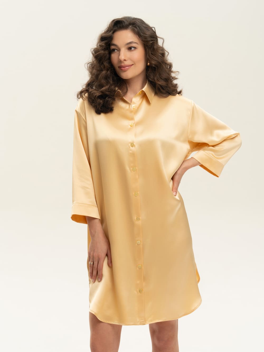 Удлиненная рубашка из премиальной коллекции Pijama story Exclusive в цвете светлого золота. Свободного кроя с Удлиненная рубашка из премиальной коллекции Pijama Story Exclusive в янтарно-медовом оттенке. Свободного кроя с пуговицами. Рубашка выполнена полностью закрытыми швами с изнаночной стороны ювелирным люксовым шитьем. Шелк Mulberry - ценнейший вид шелка, сотканный из тончайших нитей тутового шелкопряда. Обладает прочным плетением и гипоаллергенными свойствами. ШЕЛК - это ткань, которая заявляет о себе. Он красивый, элегантный и роскошный, невероятно мягкий и чувственный. Сделано в России. Параметры модели : рост 175, 88-60-90. Доступен к заказу только при 100% оплате.