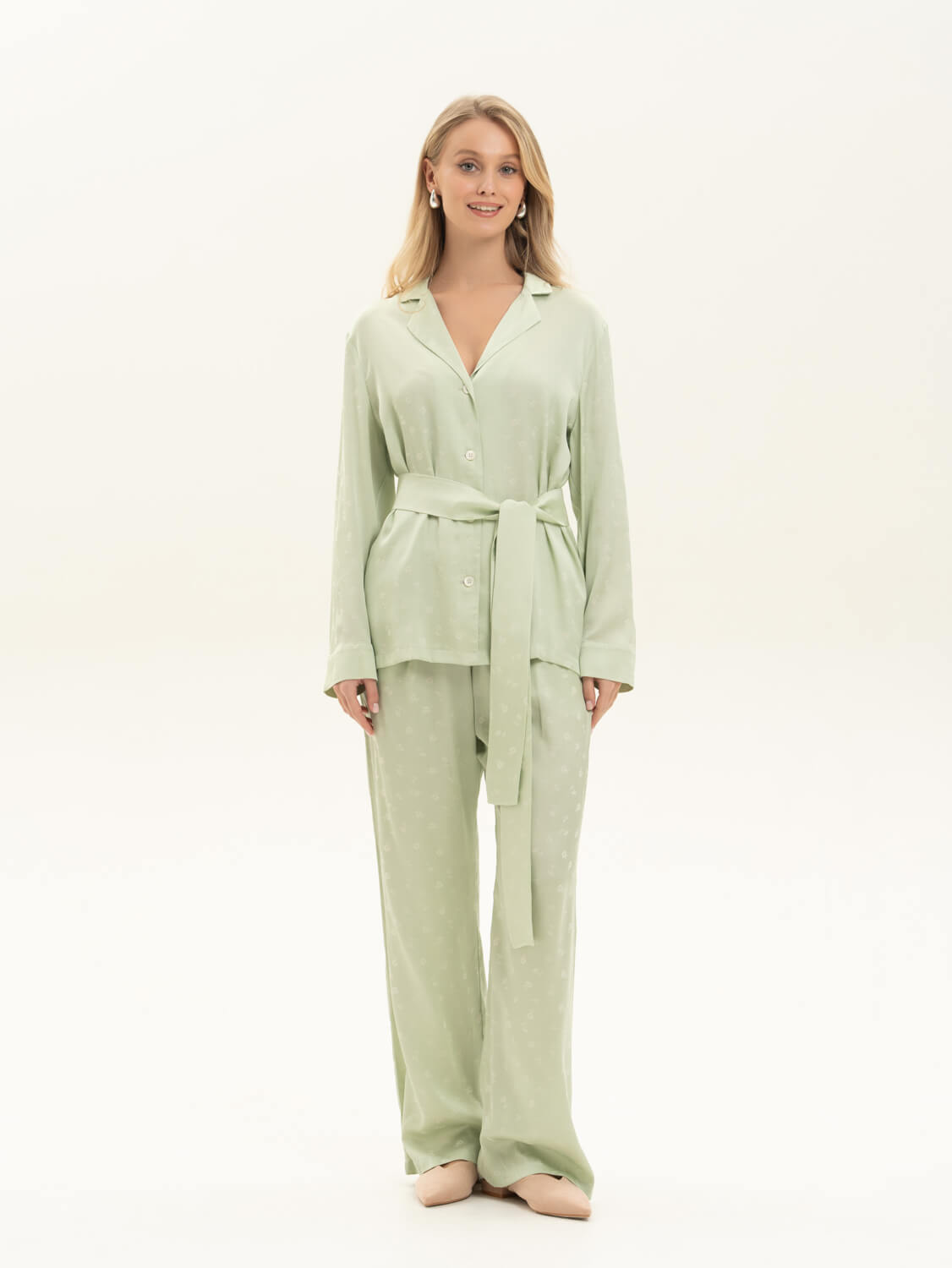 Комплект из жаккардовой вискозы с мелким цветочным принтом на нежно салатовом фоне. Плательная ткань с сатиновым переплетением, с небольшим блеском. Визуально напоминает шелк. Легкая, хорошо драпируется, не электризуется, дышит. Рубашка свободного кроя на пуговицах, брюки прямого кроя с поясом и комфортной резинкой со стороны спинки. Сделано в России. Параметры модели : рост 175, 88-60-90