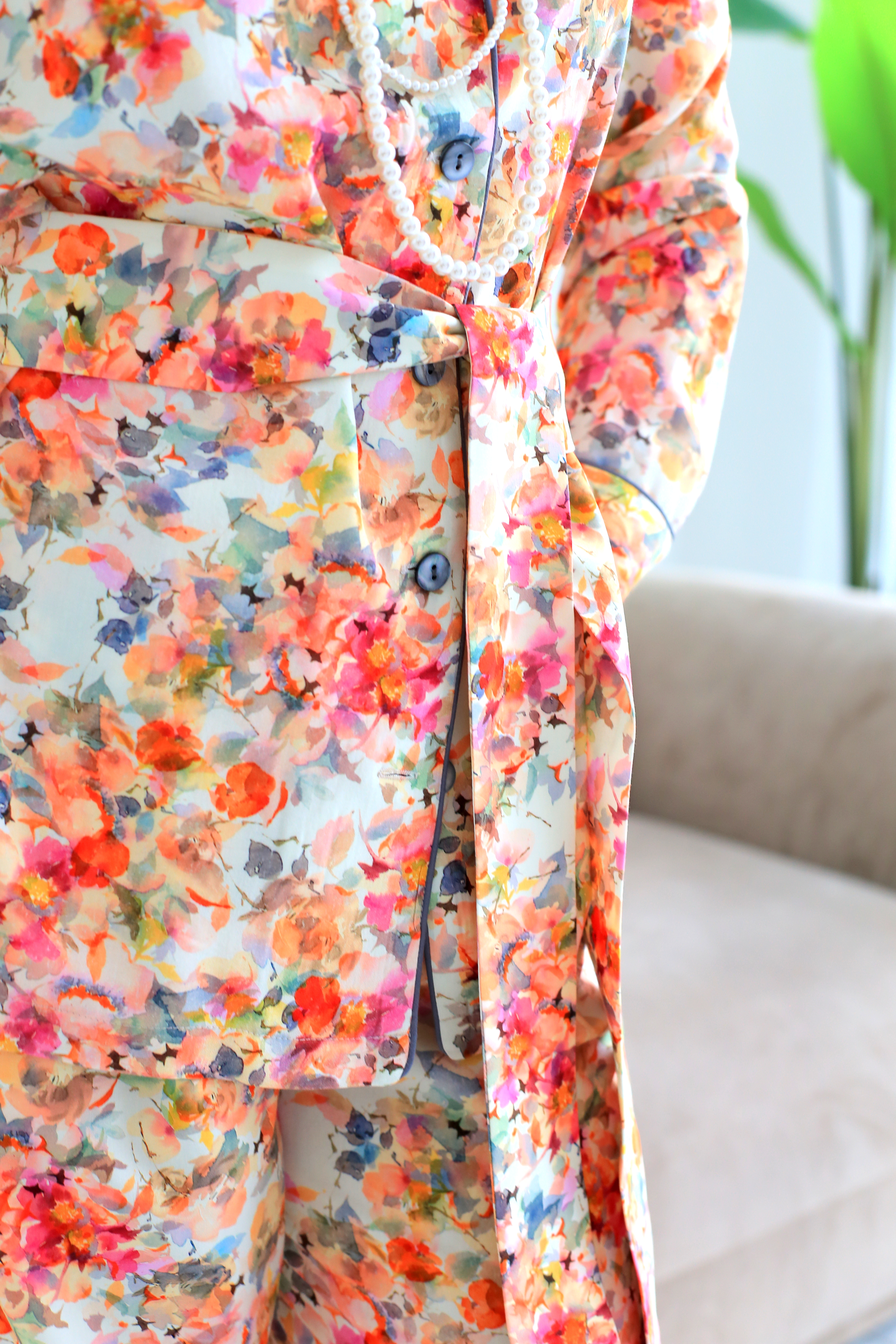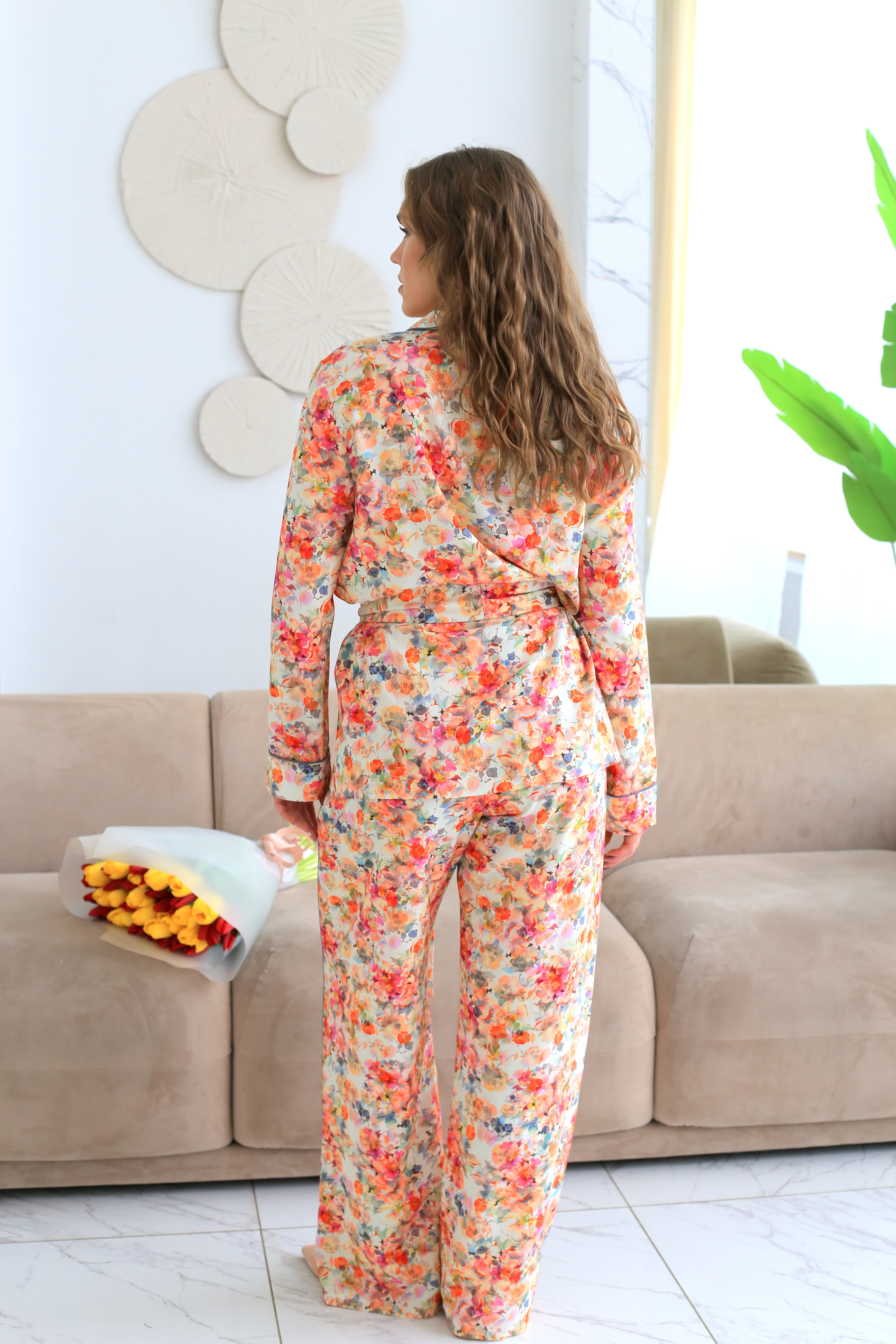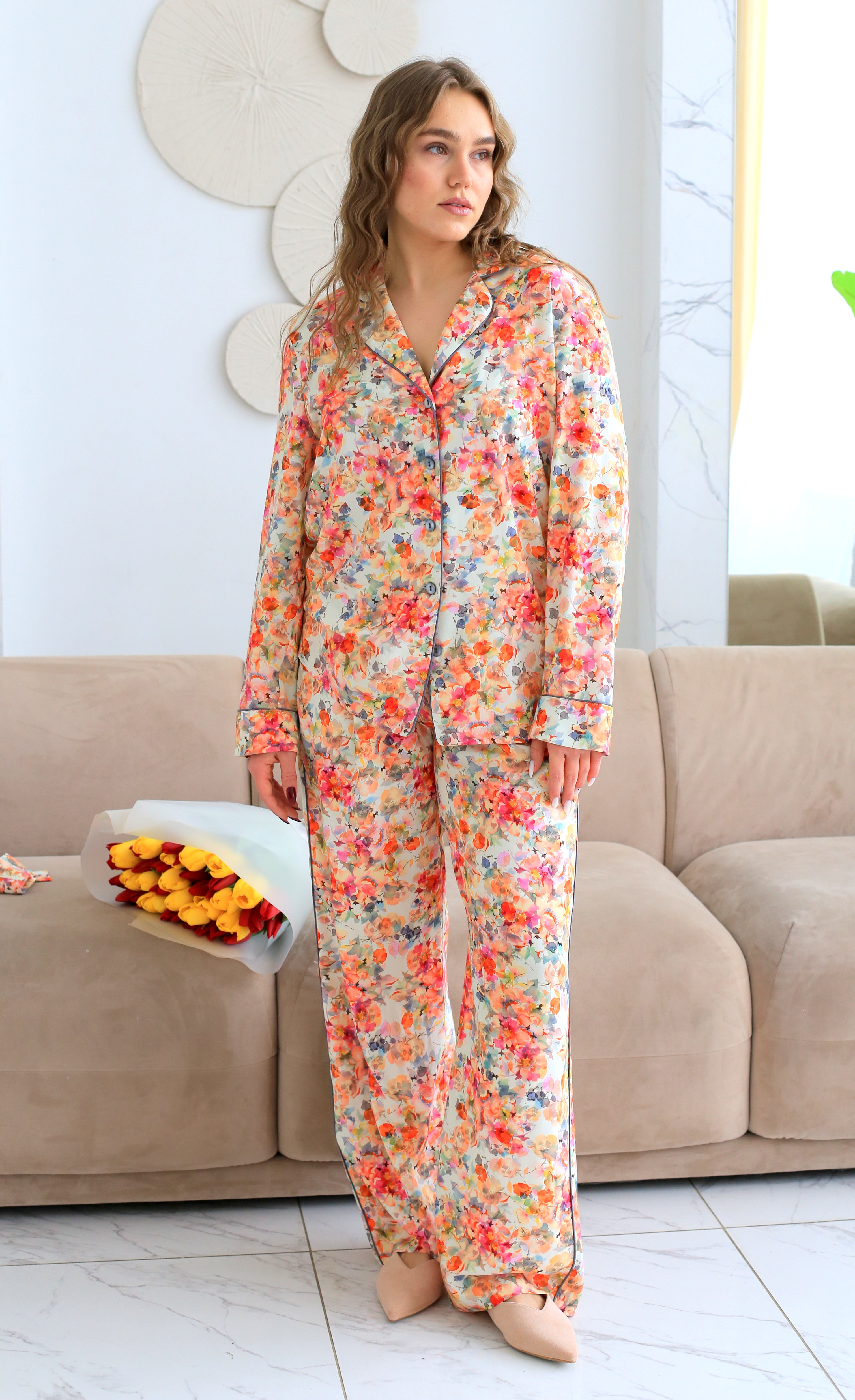 Комплект из вискозы с цветочным принтом. Ткань легкая, хорошо дышит. Выполнен комплект в свободном крое. Струящаяся рубашка, брюки с эластичной резинкой в талии. Производство Россия