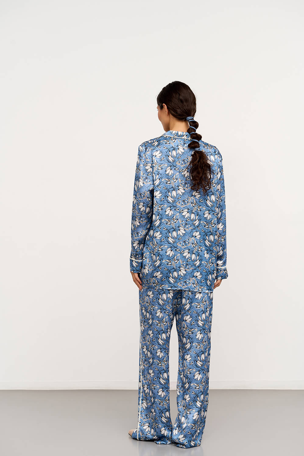 Пижамный комплект из премиальной коллекции Pijama Story Exclusive. На небесно-голубом оттенке расположился принт бабочки. Рубашка свободного кроя с пуговицами и кантом светло-молочного оттенка по борту и на манжетах. Брюки свободного кроя: спереди пояс, сзади резинка для комфорта движений не только дома, а так же и на отдыхе или вечеринке. Пижама выполнена с полностью закрытыми швами с изнаночной стороны ювелирным люксовым шитьем. Шелк Mulberry - ценнейший вид шелка, сотканный из тончайших нитей тутового шелкопряда. Обладает прочным плетением и гипоаллергенными свойствами. ШЕЛК - это ткань, которая заявляет о себе. Он красивый, элегантный и роскошный, невероятно мягкий и чувственный. Сделано в России. Параметры модели: 85/63/94. Рост 176 см.