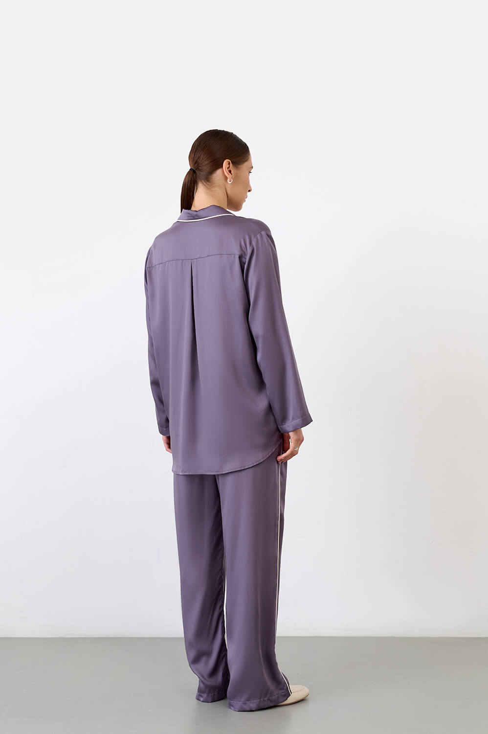 Комплект из 100% тенселя в фиолетовом оттенке. Ткань нового поколения, вырабатывается из эвкалиптового волокна. Приятная на ощупь, гладкая и мягкая. Ткань обладает комфортными тактильными свойствами, мягко струится, не пиллингуется и не линяет. Костюм состоит из удлиненной рубашки, брюк с эластичным поясом и карманами. Сделано в России.