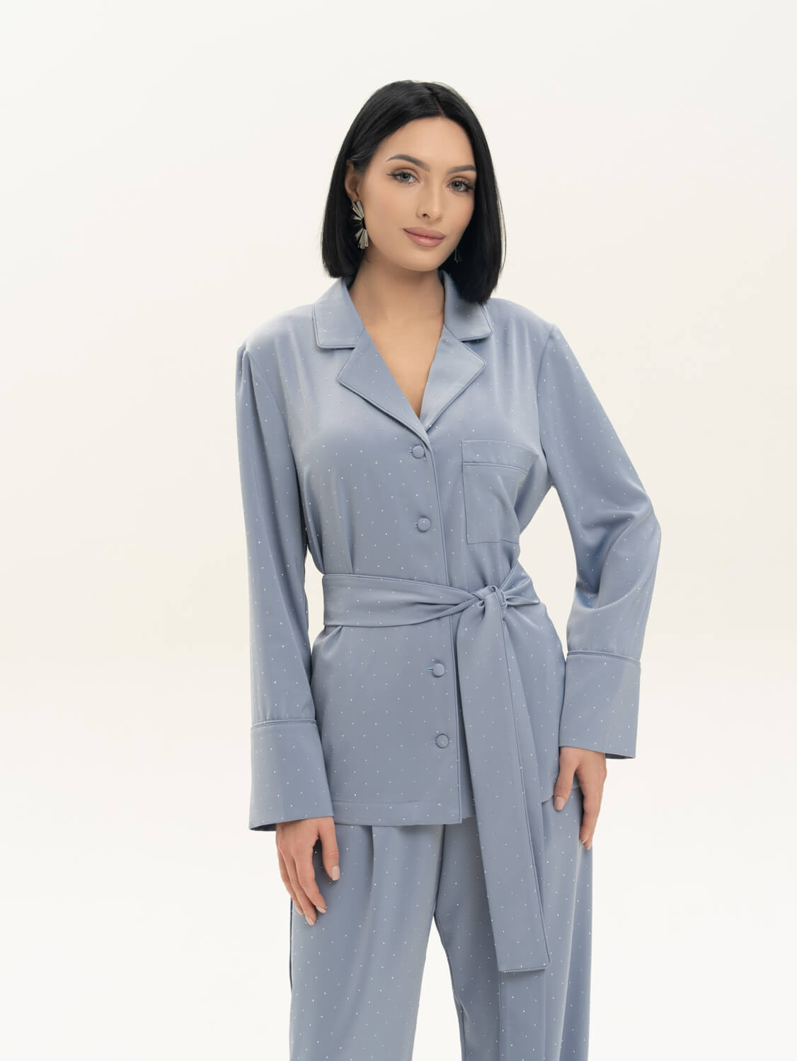 Костюм из лимитированной коллекции Pijama Story Exclusive в нежном голубом оттенке. Выполнена из смесового шелка с серебряными стразами. Рубашка свободного кроя с пуговицами и кантом в цвет пижамы по борту и на манжетах. Брюки свободного кроя: спереди пояс, сзади резинка для комфорта движений. В комлекте пояс. Будет актуальным для вечеринки или мероприятий всесезонно. Он красивый, элегантный и роскошный, легко сочетается с базовыми предметами гардероба. Сделано в России. Параметры модели:рост 170, 85-62-87