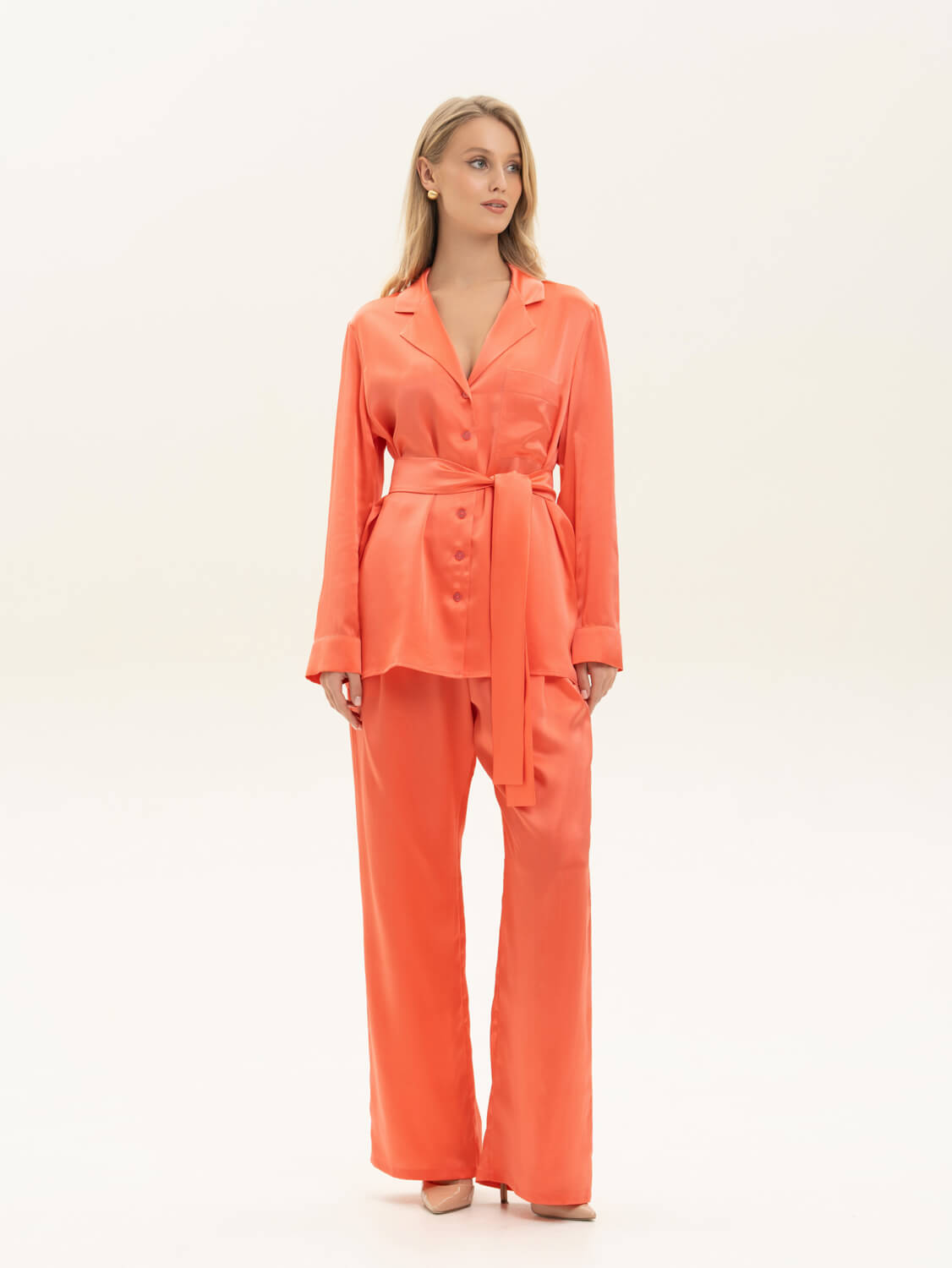 Пижамный комплект из премиальной коллекции Pijama Story Exclusive в насыщенном коралловом оттенке . Рубашка свободного кроя с пуговицами. Брюки свободного кроя: спереди пояс, сзади резинка для комфорта движений не только дома, а так же и на отдыхе или вечеринке. Пижама выполнена с полностью закрытыми швами с изнаночной стороны ювелирным люксовым шитьем. Шелк Mulberry - ценнейший вид шелка, сотканный из тончайших нитей тутового шелкопряда. Обладает прочным плетением и гипоаллергенными свойствами ШЕЛК - это ткань, которая заявляет о себе. Он красивый, элегантный и роскошный, невероятно мягкий и чувственный. Сделано в России. Параметры модели: рост 175, 88-60-90