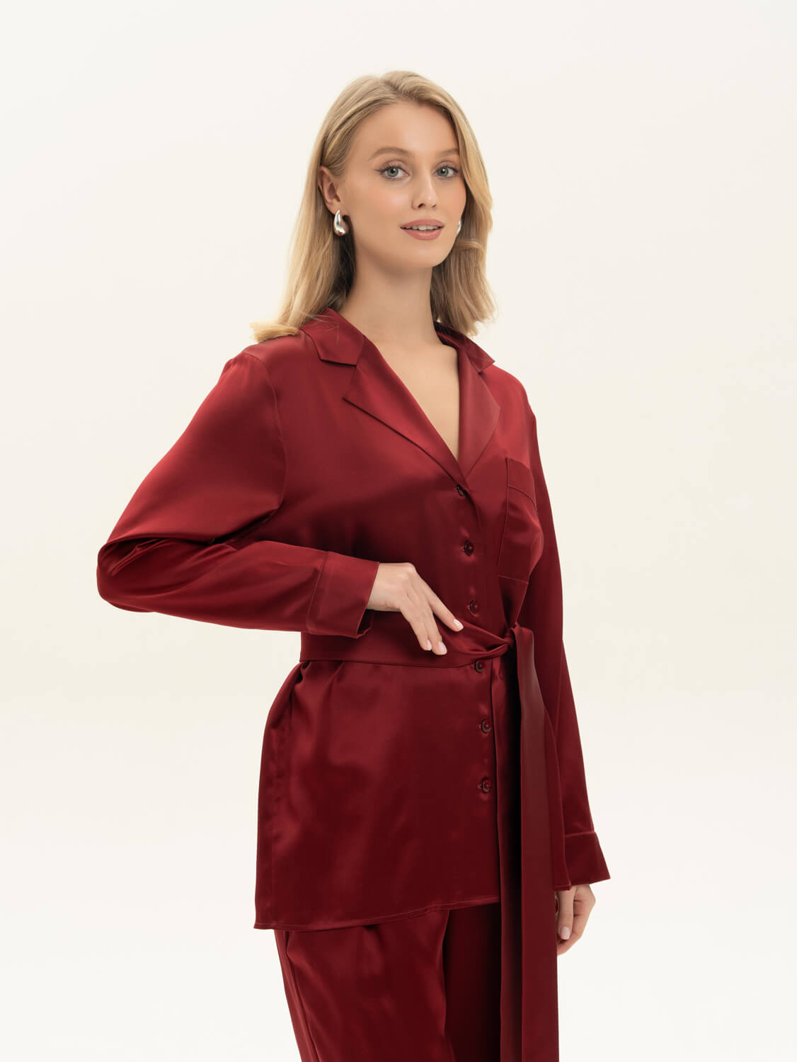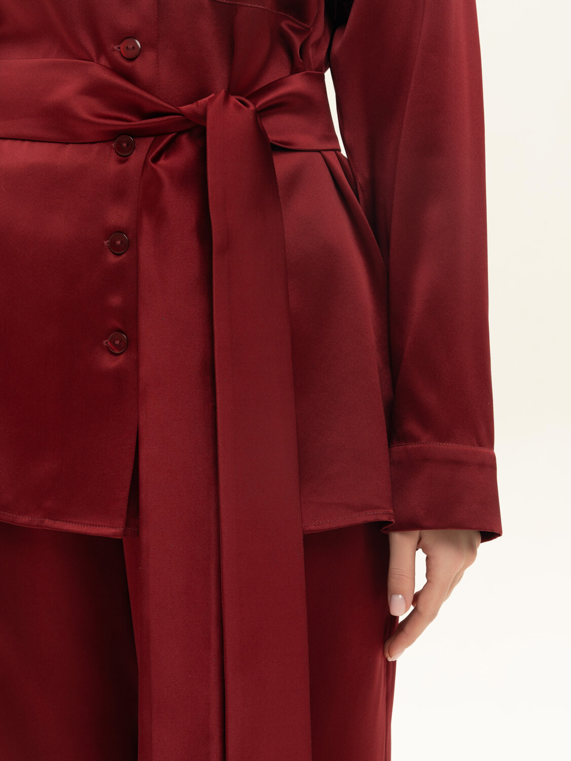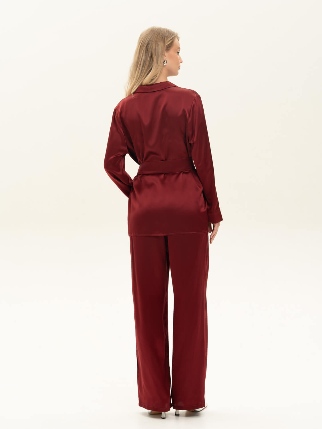 Пижамный комплект из премиальной коллекции Pijama Story Exclusive в насыщенном винном оттенке. Рубашка с пуговицами. Брюки свободного кроя: спереди пояс, сзади резинка для комфорта движений не только дома, а так же и на отдыхе или вечеринке. Пижама выполнена с полностью закрытыми швами с изнаночной стороны ювелирным люксовым шитьем. Шелк Mulberry - ценнейший вид шелка, сотканный из тончайших нитей тутового шелкопряда. Обладает прочным плетением и гипоаллергенными свойствами. ШЕЛК - это ткань, которая заявляет о себе. Он красивый, элегантный и роскошный, невероятно мягкий и чувственный. Сделано в России. Параметры модели: рост 175, 88-66-90