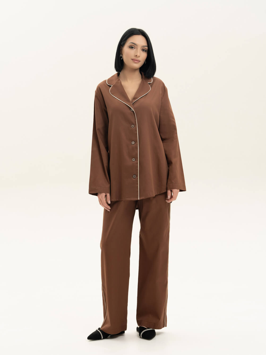 Комплект из 100% тенселя-сатина в оттенке какао. Ткань нового поколения, вырабатывается из эвкалиптового волокна. Приятная на ощупь, гладкая и мягкая. Ткань обладает комфортными тактильными свойствами, хрустит и после стирки становится мягче. Не пиллингуется и не линяет. Костюм состоит из свободной удлиненной рубашки, борт обработан молочным кантом, брюки с эластичным поясом и карманами.Сделано в России. Параметры модели: рост 170, 85-62-87