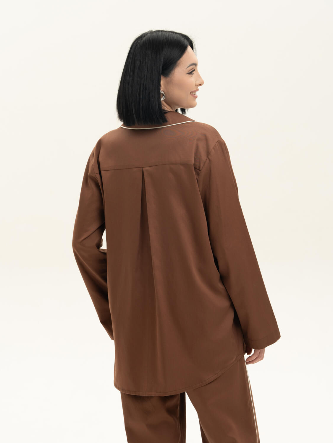 Комплект из 100% тенселя-сатина в оттенке какао. Ткань нового поколения, вырабатывается из эвкалиптового волокна. Приятная на ощупь, гладкая и мягкая. Ткань обладает комфортными тактильными свойствами, хрустит и после стирки становится мягче. Не пиллингуется и не линяет. Костюм состоит из свободной удлиненной рубашки, борт обработан молочным кантом, брюки с эластичным поясом и карманами.Сделано в России. Параметры модели: рост 170, 85-62-87