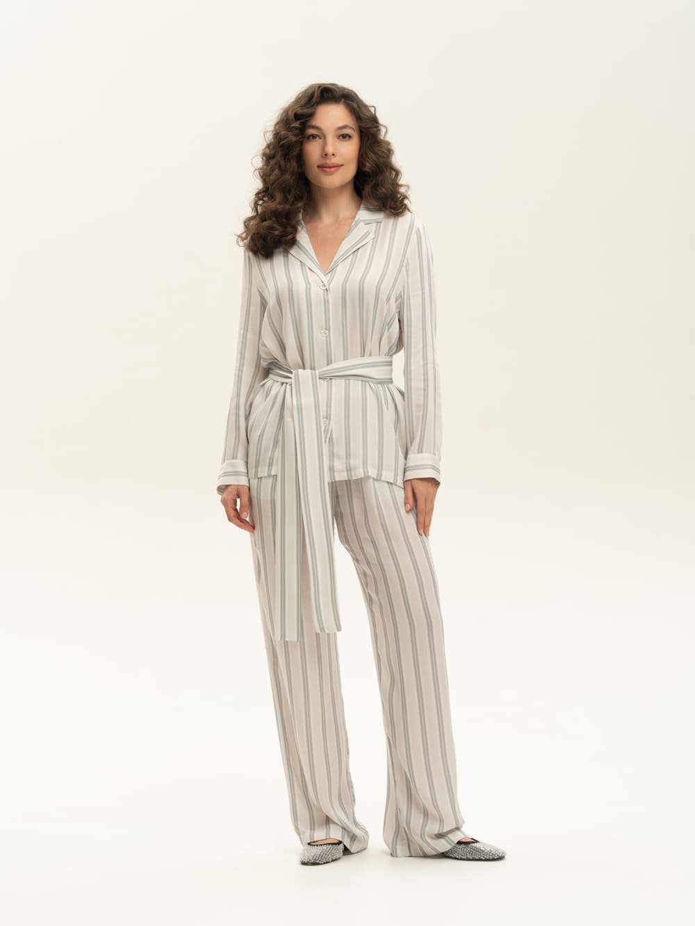 Костюм в винтажную полоску выполнен из невесомой итальянской вискозы. Брюки прямого кроя с эластичной резинкой в талии. Рубашка свободная. В комплекте пояс.