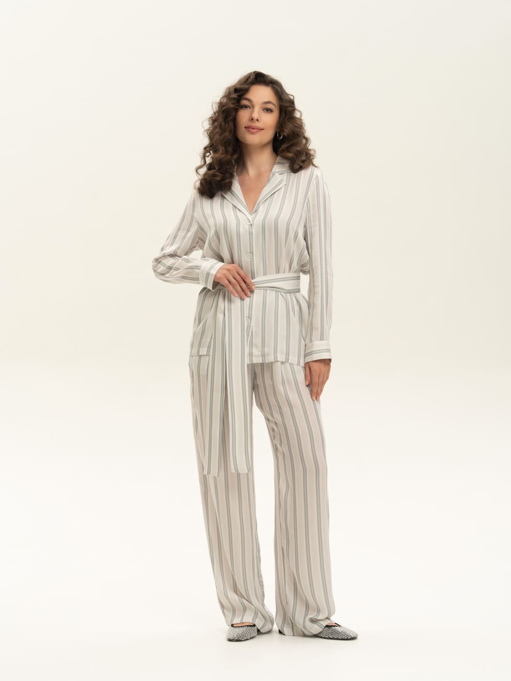 Костюм в винтажную полоску выполнен из невесомой итальянской вискозы. Брюки прямого кроя с эластичной резинкой в талии. Рубашка свободная. В комплекте пояс.