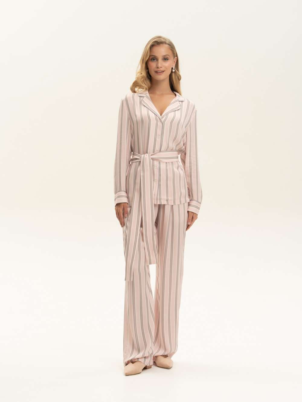 Костюм в винтажную полоску из невесомой итальянской вискозы в нежно розовой гамме. брюки с эластичной резинкой в талии. Рубашка свободная. В комплекте пояс. Сделано в России. Параметры модели: рост 175, 88-60-90