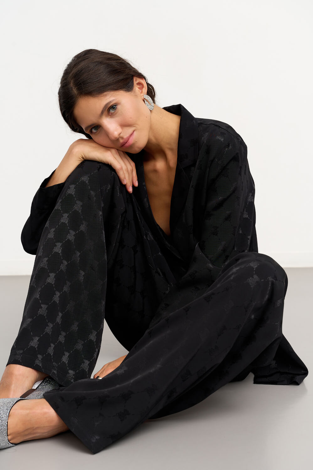 Комплект из жаккардовой вискозы с принтом "мишки" на черном фоне. Плательная ткань с сатиновым переплетением, небольшим блеском, немного тянется, не просвечивает. Визуально напоминает шелк. Легкая, хорошо драпируется, не электризуется, дышит. Рубашка свободного кроя на пуговицах в цвет пижамы, Бррюки с комфортной резинкой в талии прямого кроя. Черный костюм можно стилизовать, добавив золотых аксессуаров и лодочки - будет невероятный праздничный образ. Сделано в России.