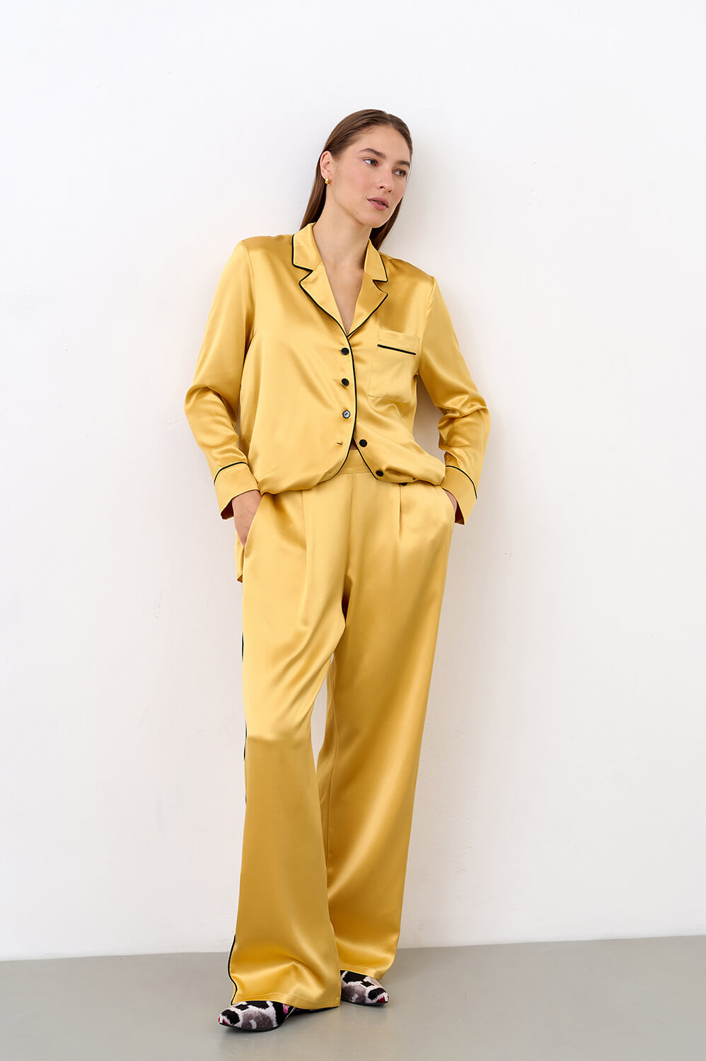 Пижамный комплект из премиальной коллекции Pijama Story Exclusive в восхитительном золотом оттенке. Рубашка свободного кроя с пуговицами и кантом черного оттенка по борту и на манжетах. Брюки свободного кроя: спереди пояс, сзади резинка для комфорта движений не только дома, а так же и на отдыхе или вечеринке. Пижама выполнена с полностью закрытыми швами с изнаночной стороны ювелирным люксовым шитьем. Шелк Mulberry- ценнейший вид шелка, сотканный из тончайших нитей тутового шелкопряда. Обладает прочным плетением и гипоаллергенными свойствами. ШЕЛК - это ткань, которая заявляет о себе. Он красивый, элегантный и роскошный, невероятно мягкий и чувственный. Сделано в России. Параметры модели: 85/63/94. Рост 176 см.