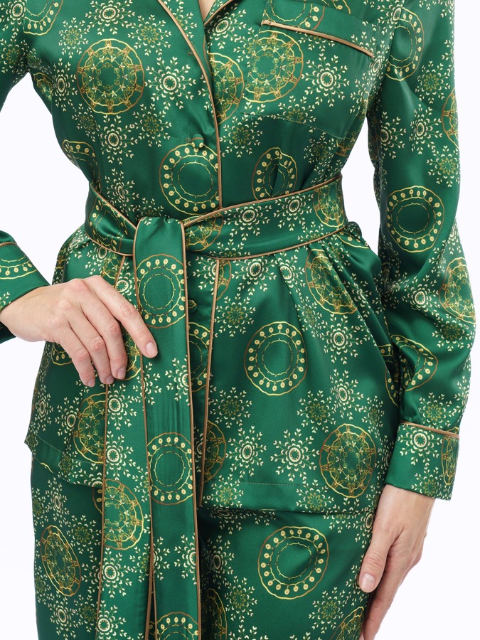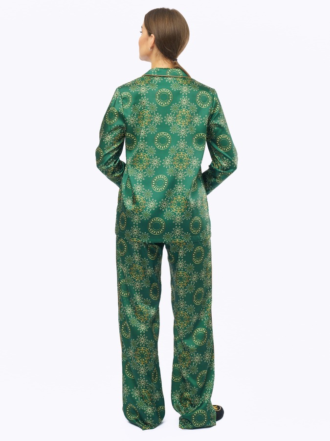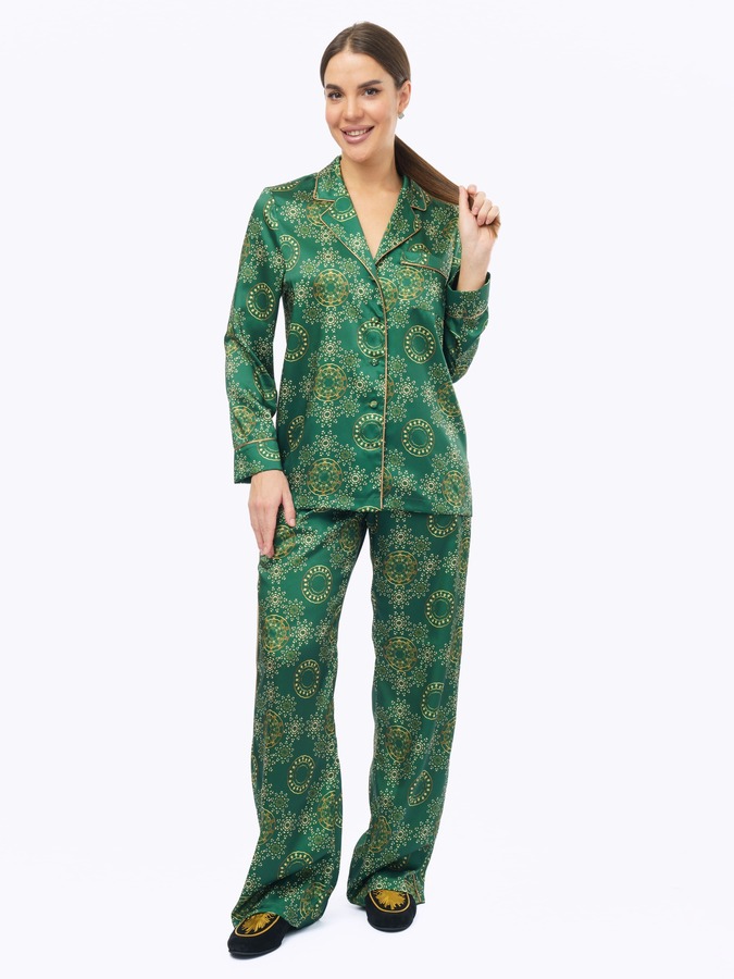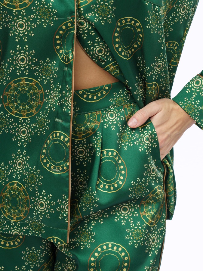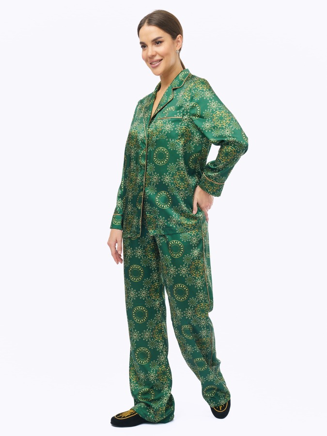 Комплект в глубоком зеленом цвете с принтом выполнен в свободном крое, обеспечивая свободу движений , а закрытые внутренние швы дарят нежность прикосновений ткани к коже.