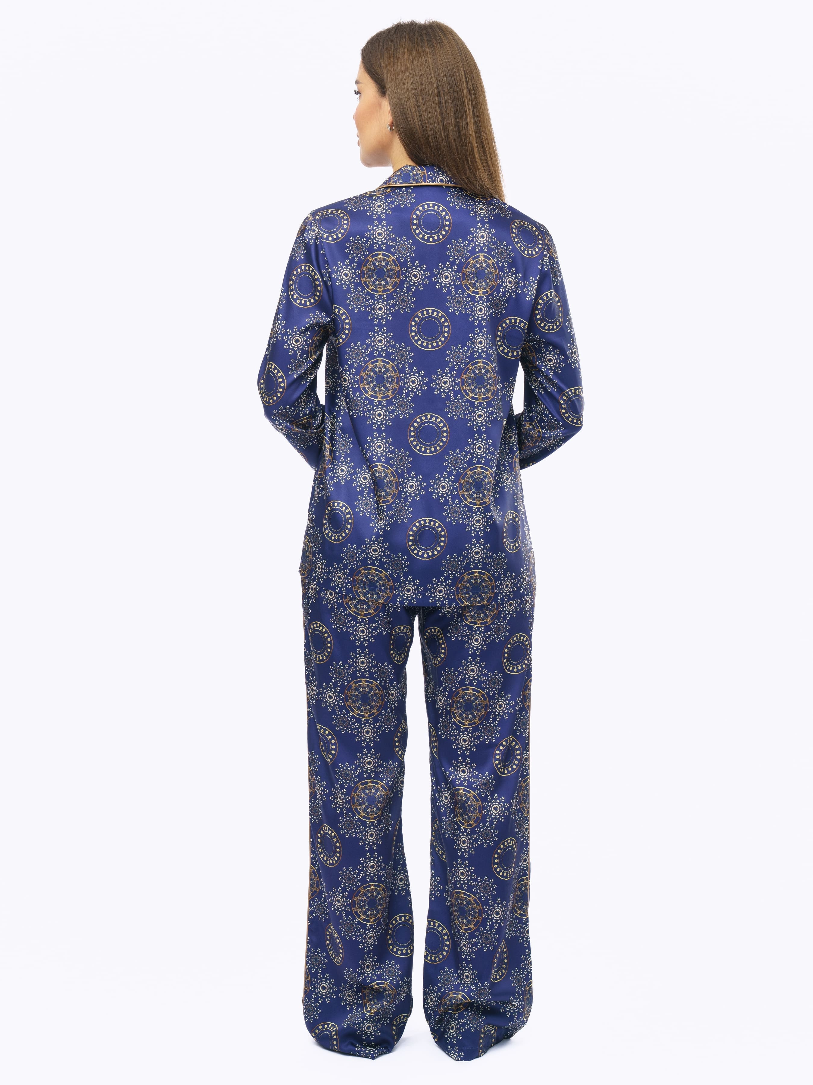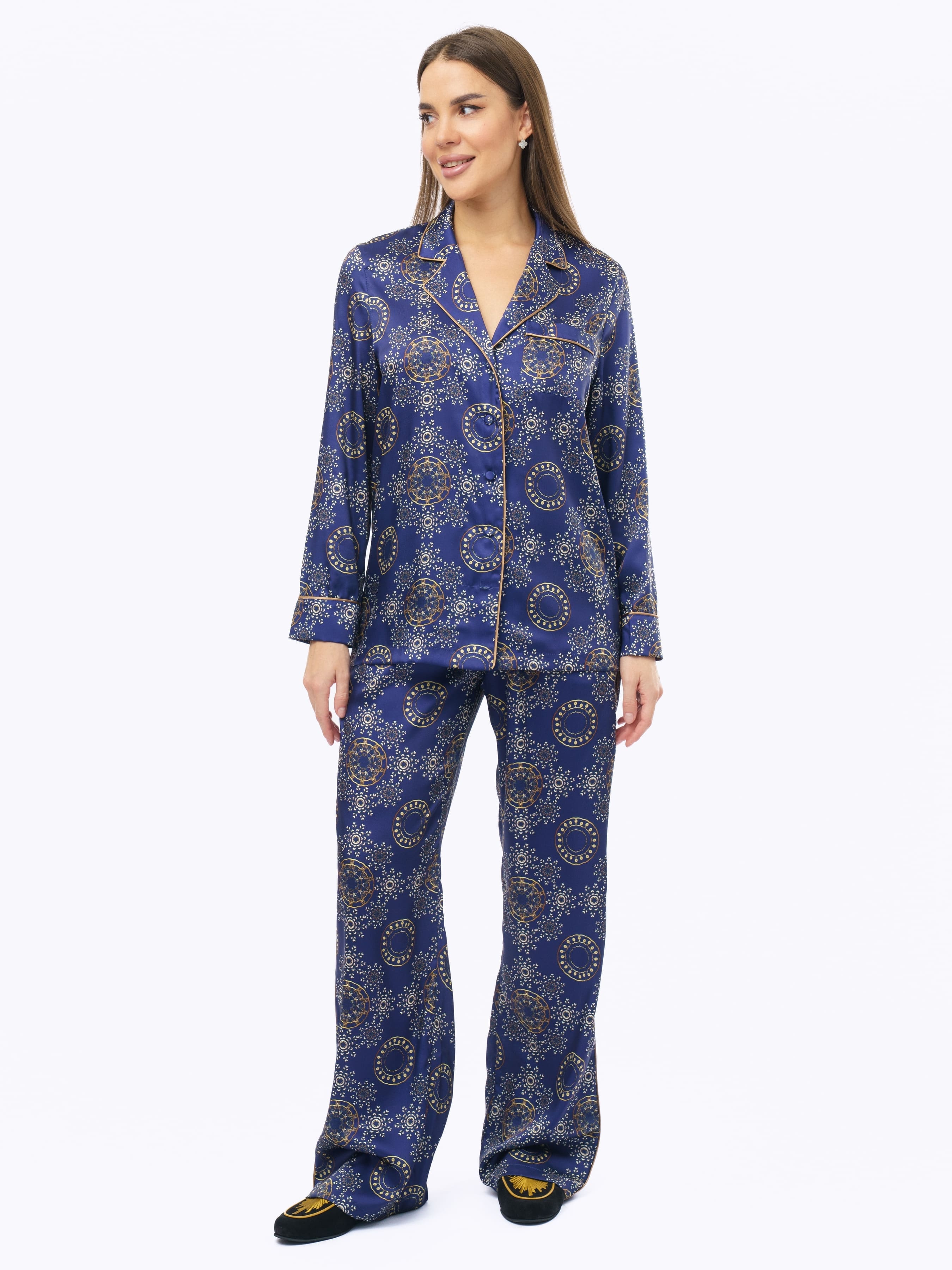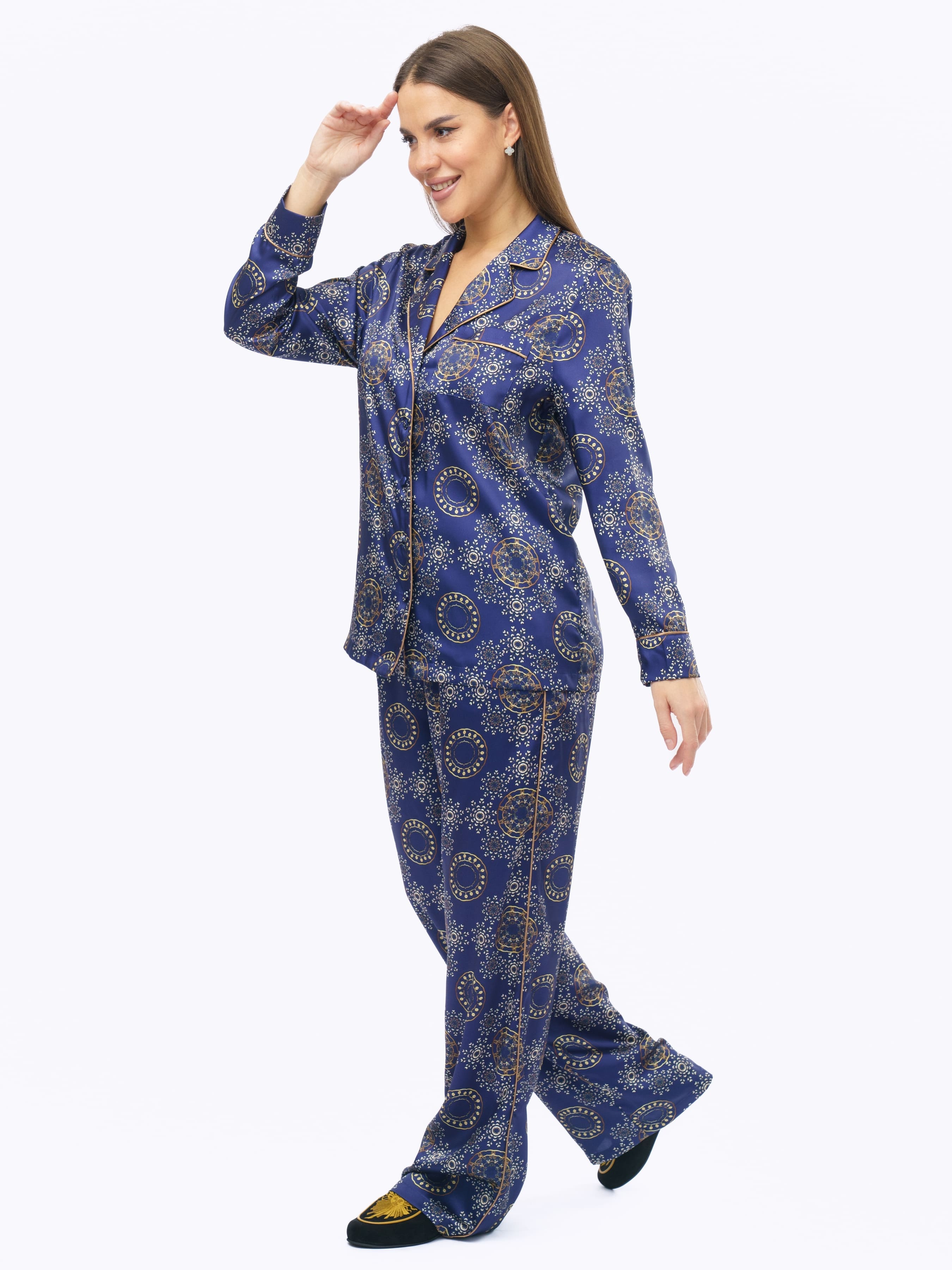 Комплект в глубоком синем цвете с принтом выполнен в свободном крое, обеспечивая свободу движений , а закрытые внутренние швы дарят нежность прикосновений ткани к коже.