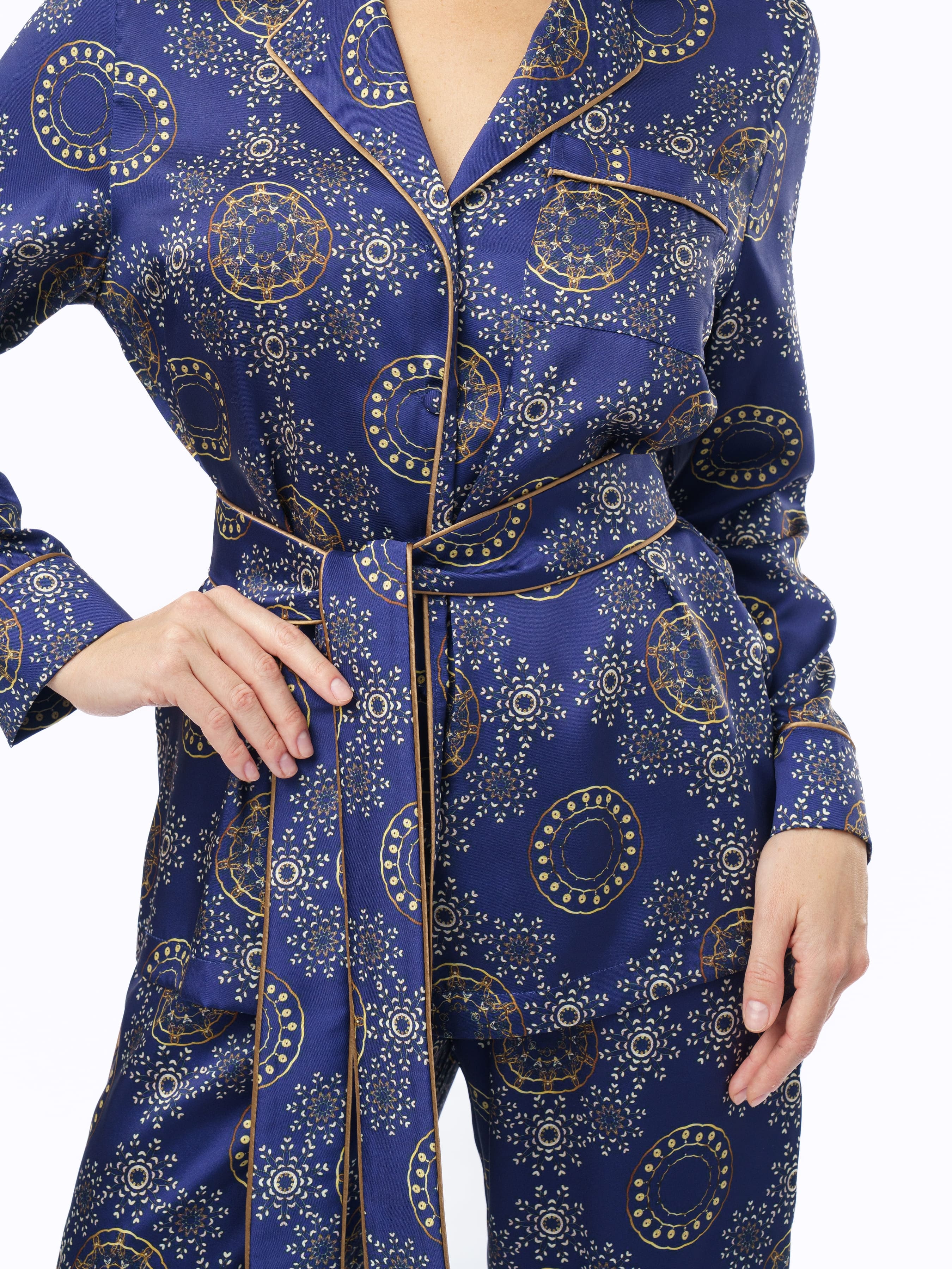 Элегантная и комфортная пижама Golden Shik выполнена из сатинового шелка. Этот уникальный материал сочетает в себе нежность шелка и износостойкость хлопка, обеспечивая ощущение легкости и свежести всесезонно.