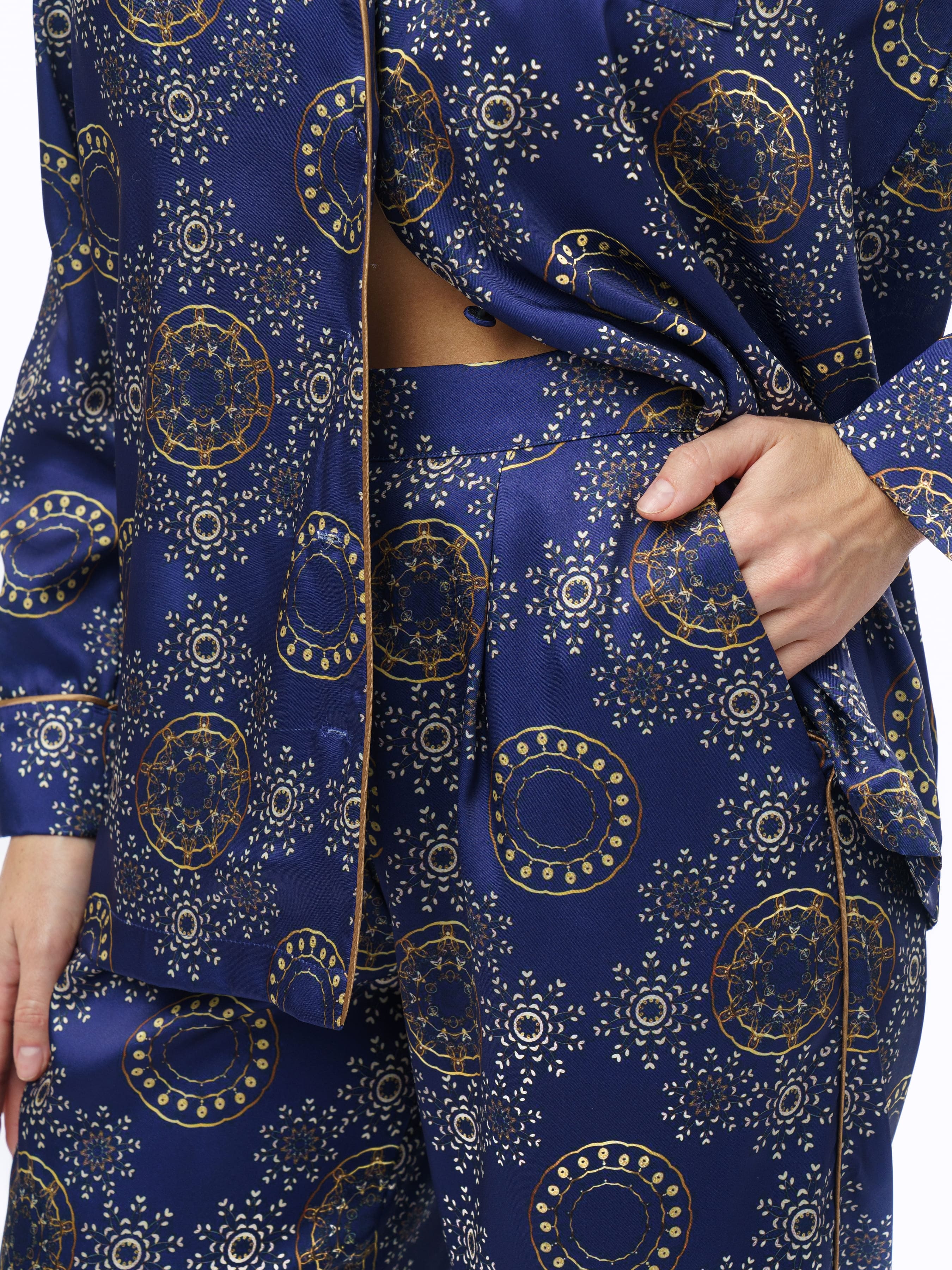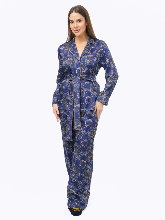 Комплект в глубоком синем цвете с принтом выполнен в свободном крое, обеспечивая свободу движений , а закрытые внутренние швы дарят нежность прикосновений ткани к коже.
