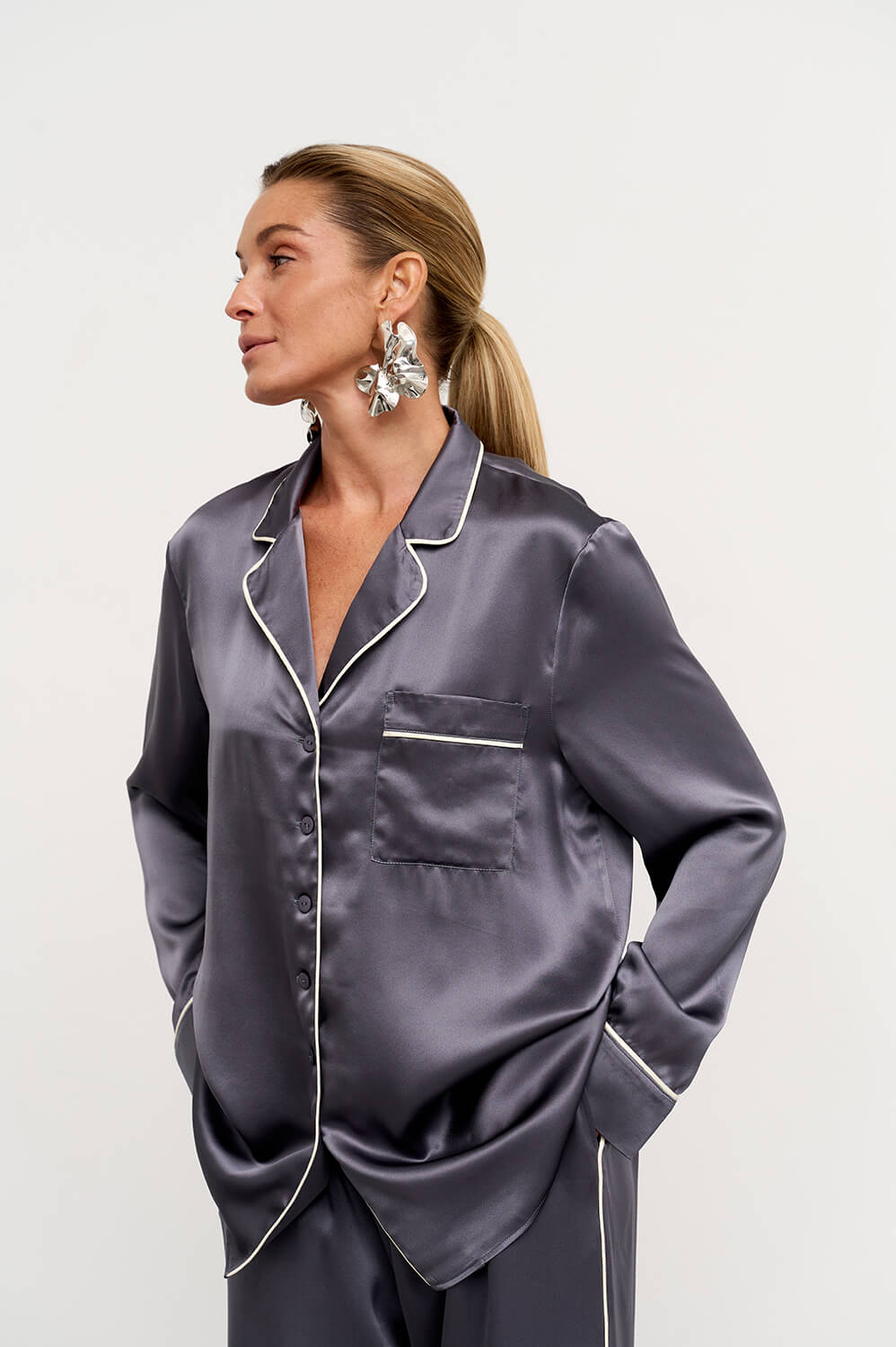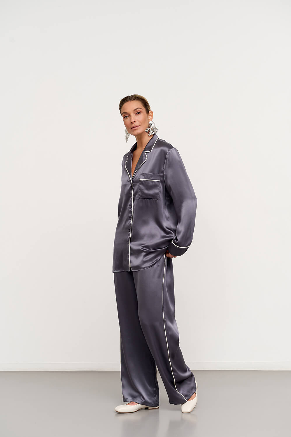 Пижамный комплект из премиальной коллекции Pijama Story Exclusive в глубоком сером цвете. Рубашка свободного кроя с пуговицами и кантом светло-молочного оттенка по борту и на манжетах. Брюки свободного кроя: спереди пояс, сзади резинка для комфорта движений не только дома, а так же и на отдыхе или вечеринке. Пижама выполнена с полностью закрытыми швами с изнаночной стороны ювелирным люксовым шитьем. Шелк Mulberry- ценнейший вид шелка, сотканный из тончайших нитей тутового шелкопряда. Обладает прочным плетением и гипоаллергенными свойствами. ШЕЛК - это ткань, которая заявляет о себе. Он красивый, элегантный и роскошный, невероятно мягкий и чувственный. Сделано в России. Параметры модели: 85/63/94. Рост 176 см.