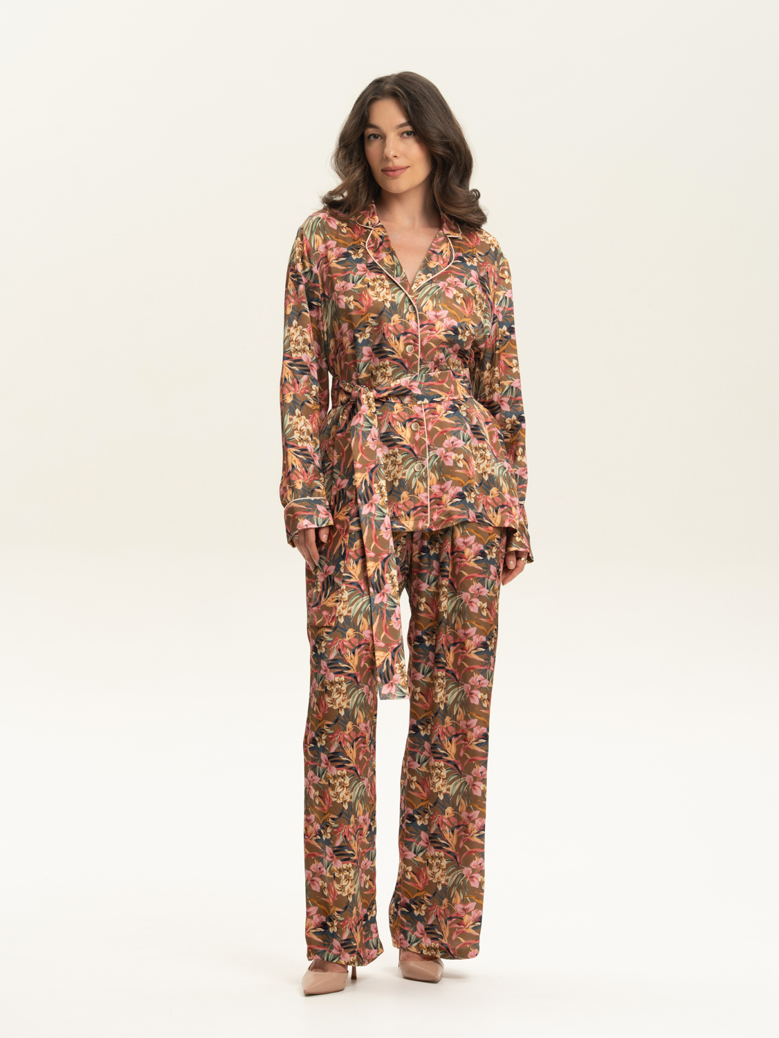Костюм выполнен из невероятно мягкой атласной вискозы с авторским принтом, разработанным специально для Pijama Story. Ткань обладает деликатным глянцем и нежно струится по коже. Цветочные мотивы в принте создают романтичное настроение и подчеркивают женственность образа. Комплект состоит и рубашки свободного кроя , отделанной молочным кантом, брюк на эластичной резинке в талии и пояса, чтобы создать более женственный силуэт. Сделано в России. Параметры модели : рост 175, 88-60-90. Скидка 20%. Стоимость указана с учетом скидки.