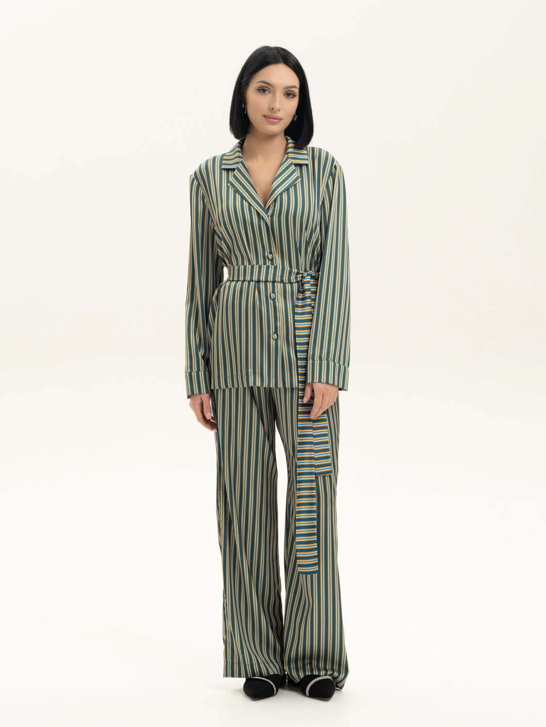 Женская пижама с длинными брюками идеально подходит для любительниц не только роскоши, но и комфорта. Брюки прямого покроя на практичной эластичной резинке удачно сочетаются с классической рубашкой с длинным рукавом и застёжкой на пуговицы. Эта пижама - отличный выбор для тех, кто ценит комфорт, качество и стиль. Она станет незаменимым элементом вашего гардероба и подарит вам праздничное настроение на пижамной вечеринке