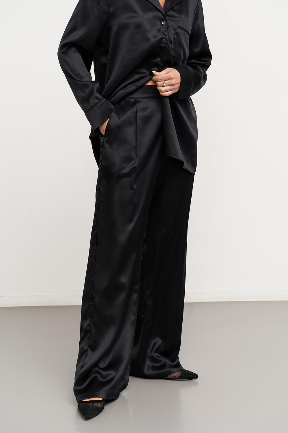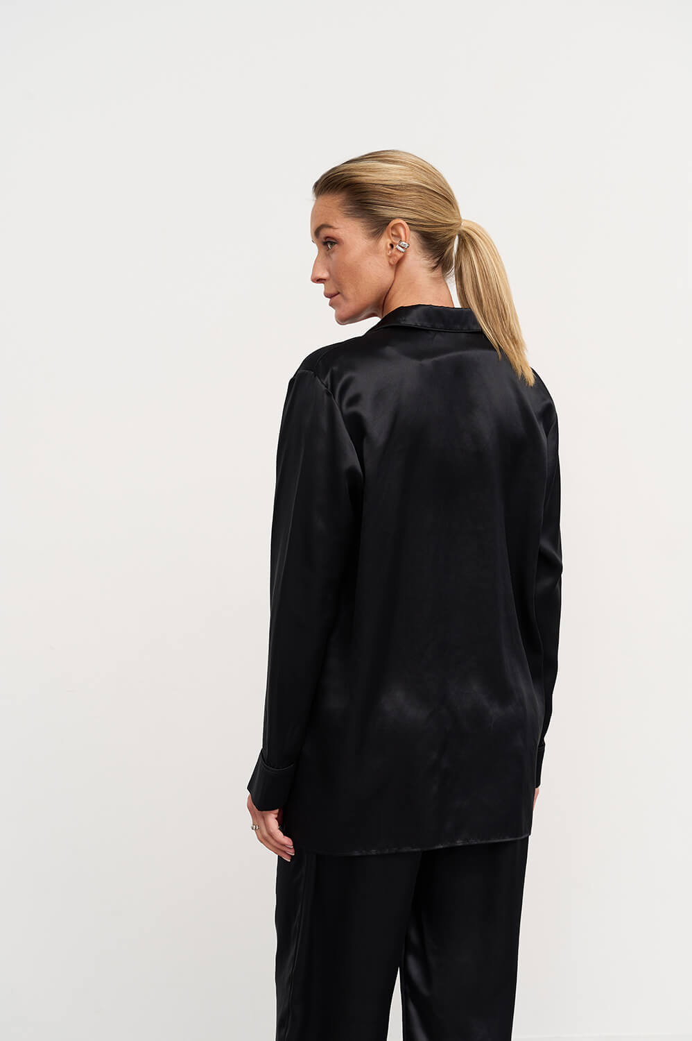 Пижамный комплект из премиальной коллекции Pijama Story Exclusive в черном цвете. Рубашка свободного кроя с пуговицами и кантом черного оттенка по борту и на манжетах. Брюки свободного кроя: спереди пояс, сзади резинка для комфорта движений не только дома, а так же и на отдыхе или вечеринке. Пижама выполнена с полностью закрытыми швами с изнаночной стороны ювелирным люксовым шитьем. Шелк Mulberry- ценнейший вид шелка, сотканный из тончайших нитей тутового шелкопряда.  Обладает прочным плетением и гипоаллергенными свойствами. ШЕЛК - это ткань, которая заявляет о себе. Он красивый, элегантный и роскошный, невероятно мягкий и чувственный. Сделано в России. Параметры модели: 85/63/94. Рост 176 см.