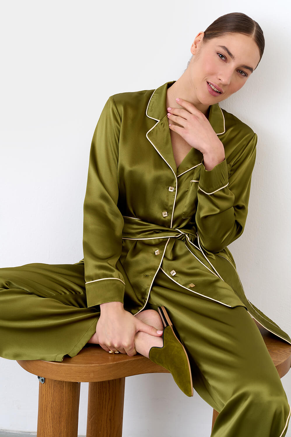 Пижамный комплект из премиальной коллекции Pijama Story Exclusive в насыщенном оливковом цвете. Рубашка свободного кроя с пуговицами. Кант светло-молочного оттенка по борту и на манжетах. Брюки свободного кроя: спереди пояс, сзади резинка для комфорта движений не только дома, а так же и на отдыхе или вечеринке. Пижама выполнена с полностью закрытыми швами с изнаночной стороны ювелирным люксовым шитьем. Шелк Mulberry- ценнейший вид шелка, сотканный из тончайших нитей тутового шелкопряда. Обладает прочным плетением и гипоаллергенными свойствами. ШЕЛК - это ткань, которая заявляет о себе. Он красивый, элегантный и роскошный, невероятно мягкий и чувственный. Сделано в России. Отправка только при 100% предоплате. Параметры модели: 85/63/94. Рост 176 см.