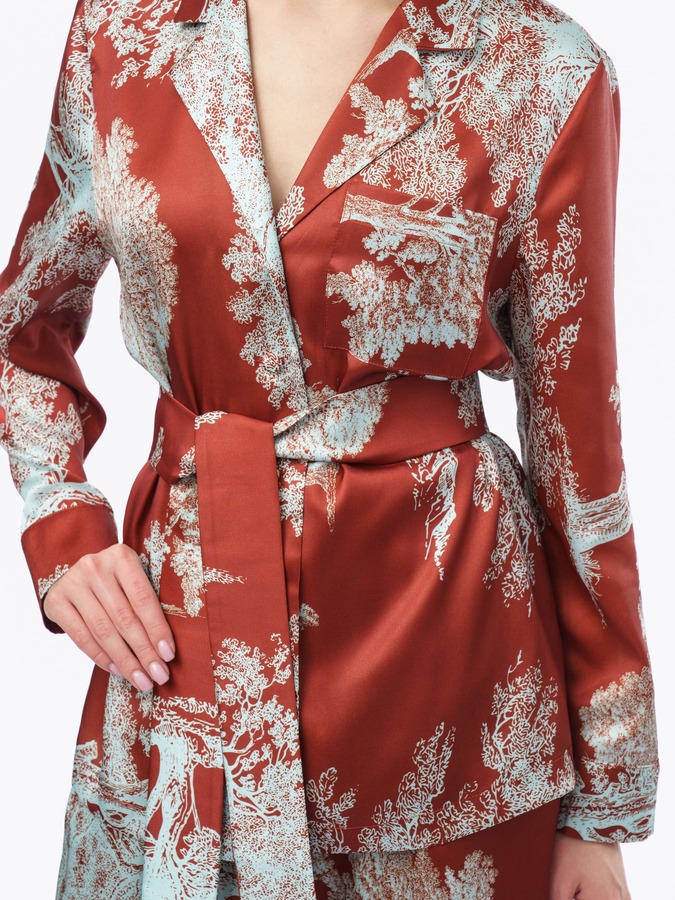 Комплект с ассиметричным растительным принтом выполнен в свободном крое, обеспечивая свободу движений , а закрытые внутренние швы дарят нежность прикосновений ткани к коже.
