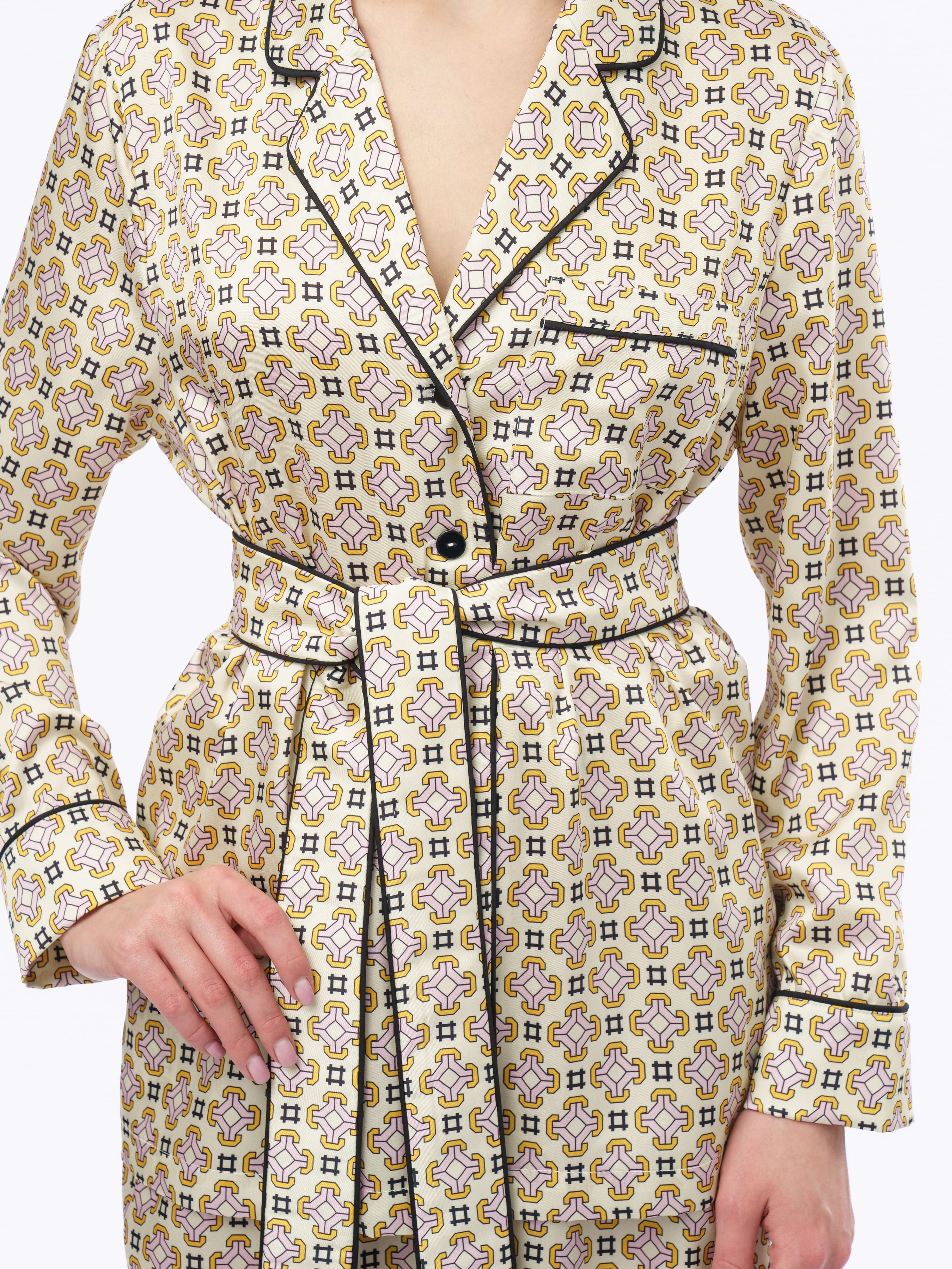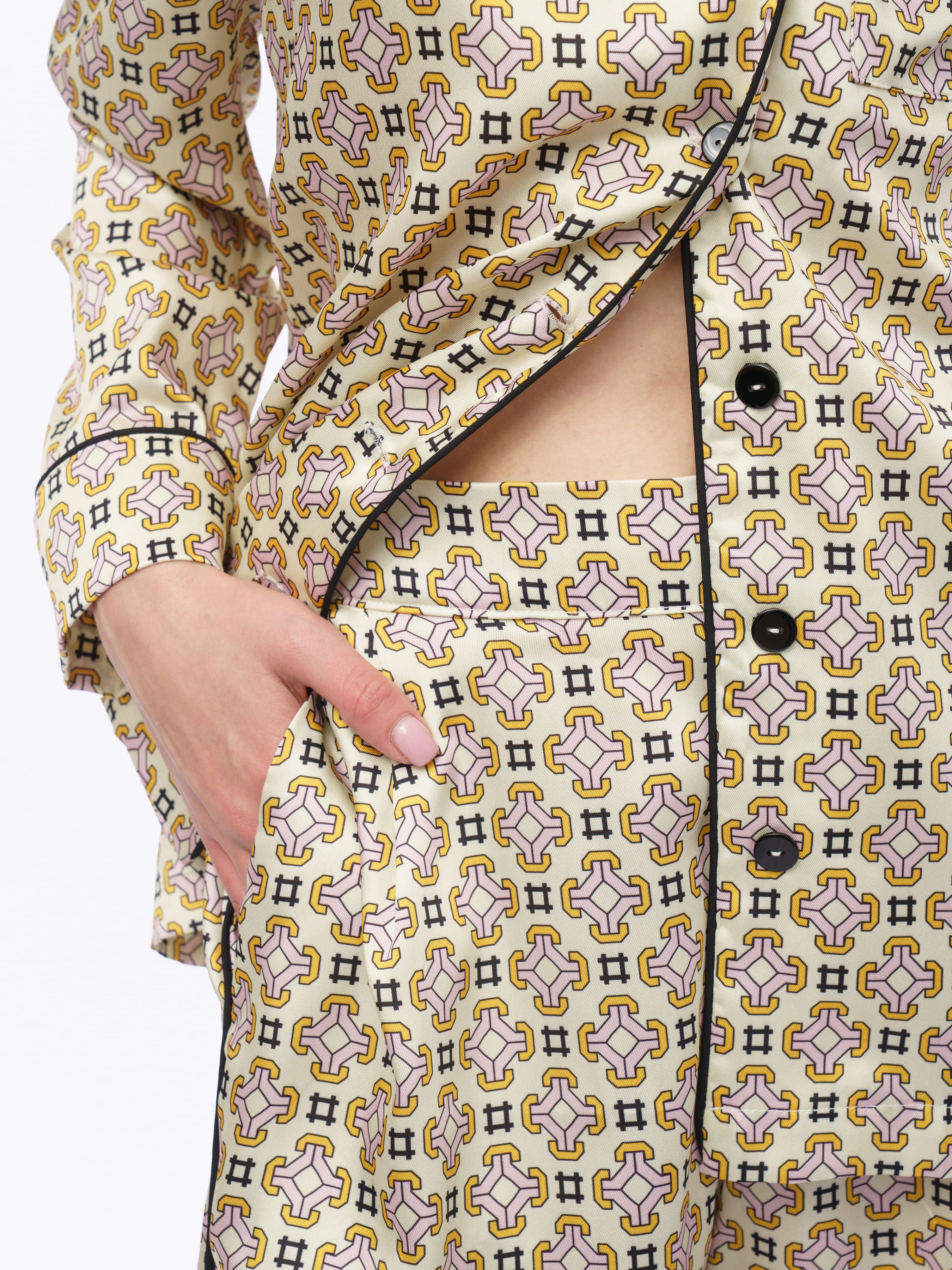 Комплект с принтом орнаменты и контрастным кантом выполнен в свободном крое, обеспечивая свободу движений , а закрытые внутренние швы дарят нежность прикосновений ткани к коже.