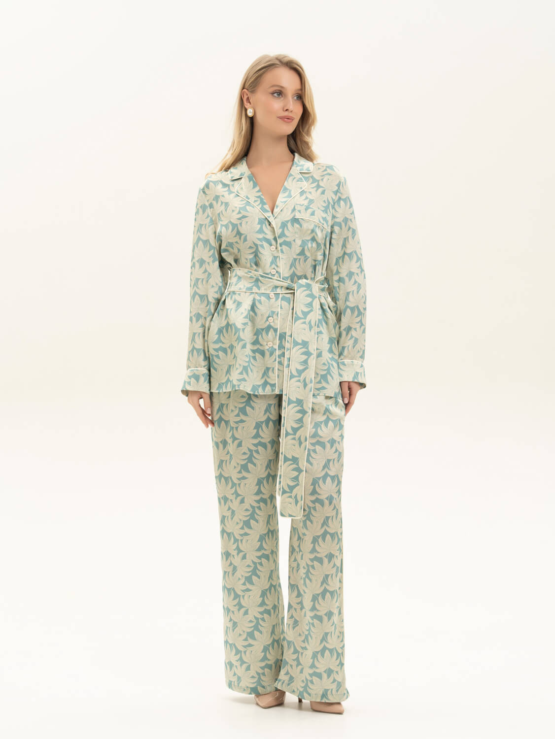 Пижамный комплект из премиальной коллекции Pijama Story Exclusive с растительным принтом на серо-голубом оттенке. Рубашка свободного кроя с пуговицами. Кант светло-молочного оттенка по борту и на манжетах. Брюки свободного кроя: спереди пояс, сзади резинка для комфорта движений не только дома, а и на отдыхе или вечеринке. Пижама выполнена с полностью закрытыми швами с изнаночной стороны ювелирным люксовым шитьем. Шелк Mulberry-ценнейший вид шелка, сотканный из тончайших нитей тутового шелкопряда. Обладает прочным плетением и гипоаллергенными свойствами. ШЕЛК - это ткань, которая заявляет о себе. Он красивый, элегантный и роскошный, невероятно мягкий и чувственный. Сделано в России. Параметры модели:рост 175, 88-60-90