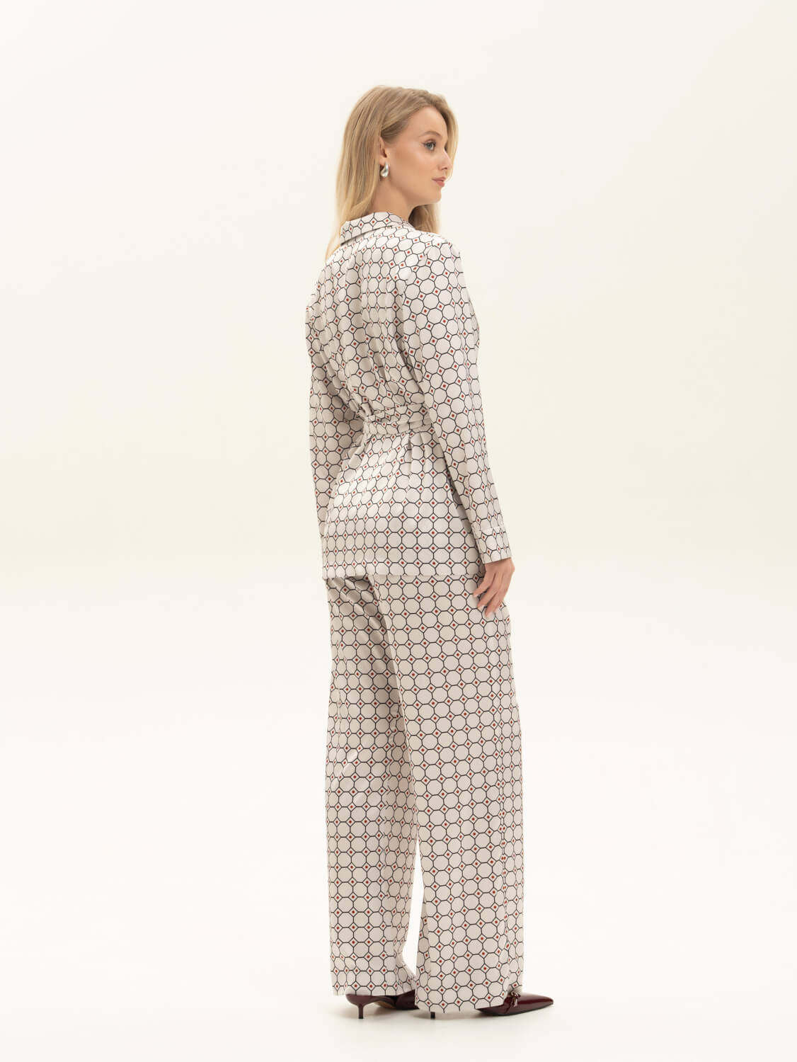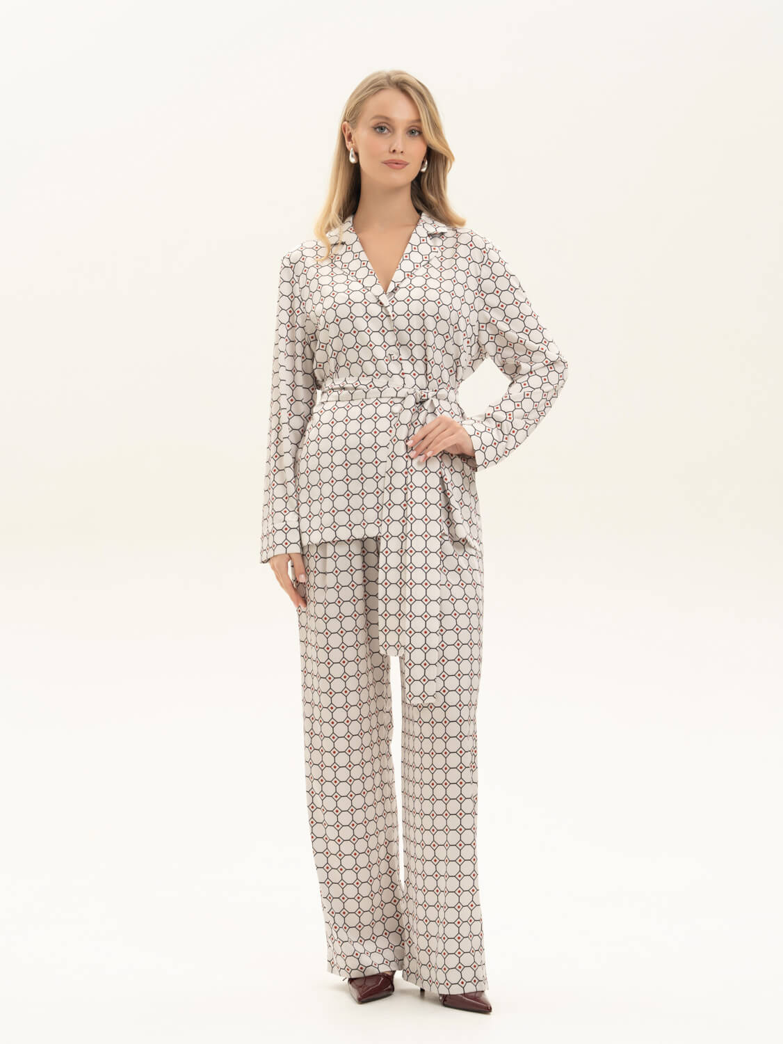Пижамный комплект из струящегося шелка Армани с геометричным принтом. Рубашка свободного кроя с пуговицами, обтянутыми в цвет ткани и брюки свободного кроя (спереди пояс, сзади резинка) для комфорта движений не только дома, а и на отдыхе или вечеринке. Сделано в России. Параметры модели: рост 175, 88-60-90