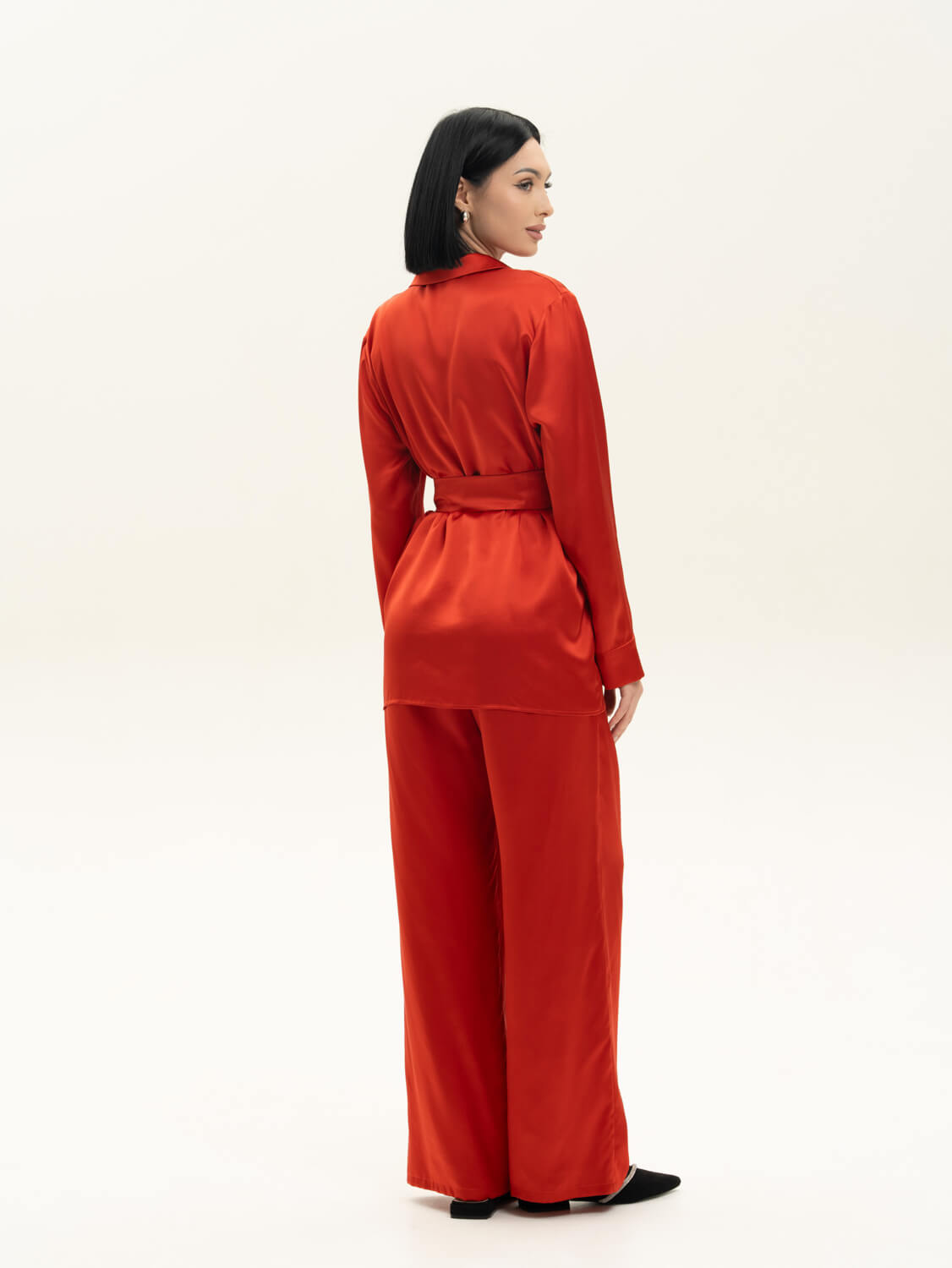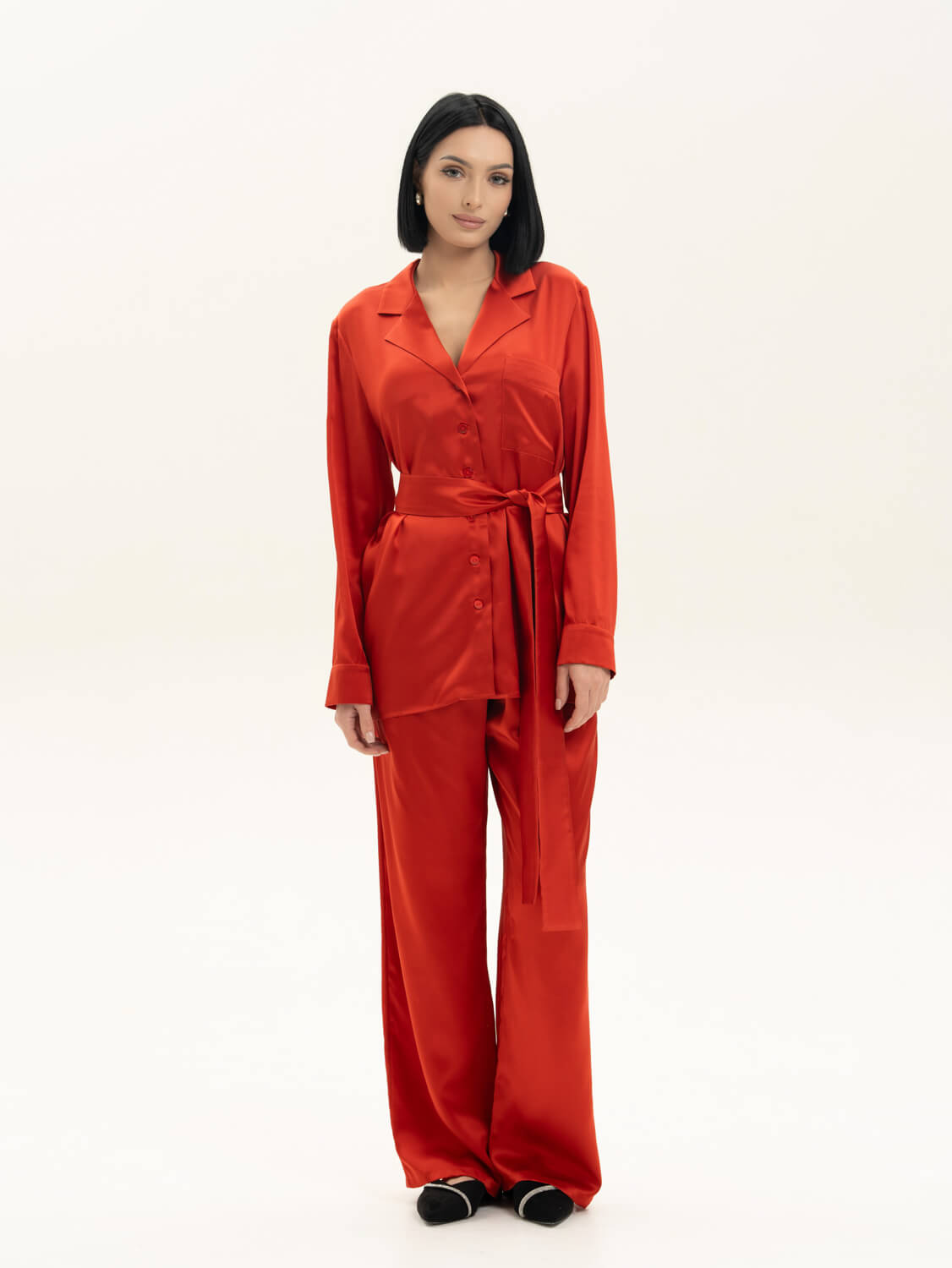 Пижамный комплект из премиальной коллекции Pijama Story Exclusive в насыщенном насыщенном алом оттенке. Рубашка свободного кроя с пуговицами. Брюки свободного кроя: спереди пояс, сзади резинка для комфорта движений не только дома, а и на отдыхе или вечеринке. Пижама выполнена с полностью закрытыми швами с изнаночной стороны ювелирным люксовым шитьем. Шелк Mulberry- ценнейший вид шелка, сотканный из тончайших нитей тутового шелкопряда. Обладает прочным плетением и гипоаллергенными свойствами. ШЕЛК - это ткань, которая заявляет о себе. Он красивый, элегантный и роскошный, невероятно мягкий и чувственный. Сделано в России. Параметры модели: рост 170, 85-62-87