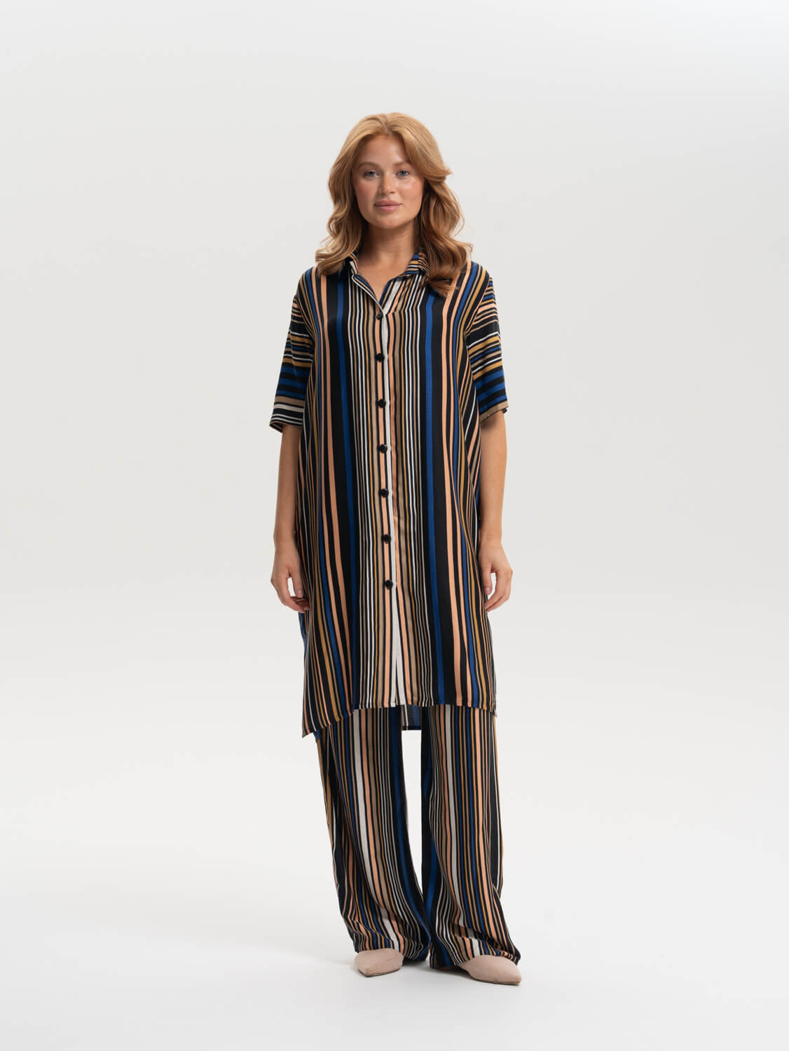 Пижамный костюм Ronda выполнен из вискозы производства Италии. Костюм включает удлиненную рубашку и брюки. Брюки классического кроя с защипами спереди под поясом и комфортной резинкой в талии со стороны спины, подарят полный комфорт в посадке. В таком пижамном костюме можно провести домашний вечер в кругу друзей или отправиться в путешествие, для прогулок по теплым улицам южных городов.