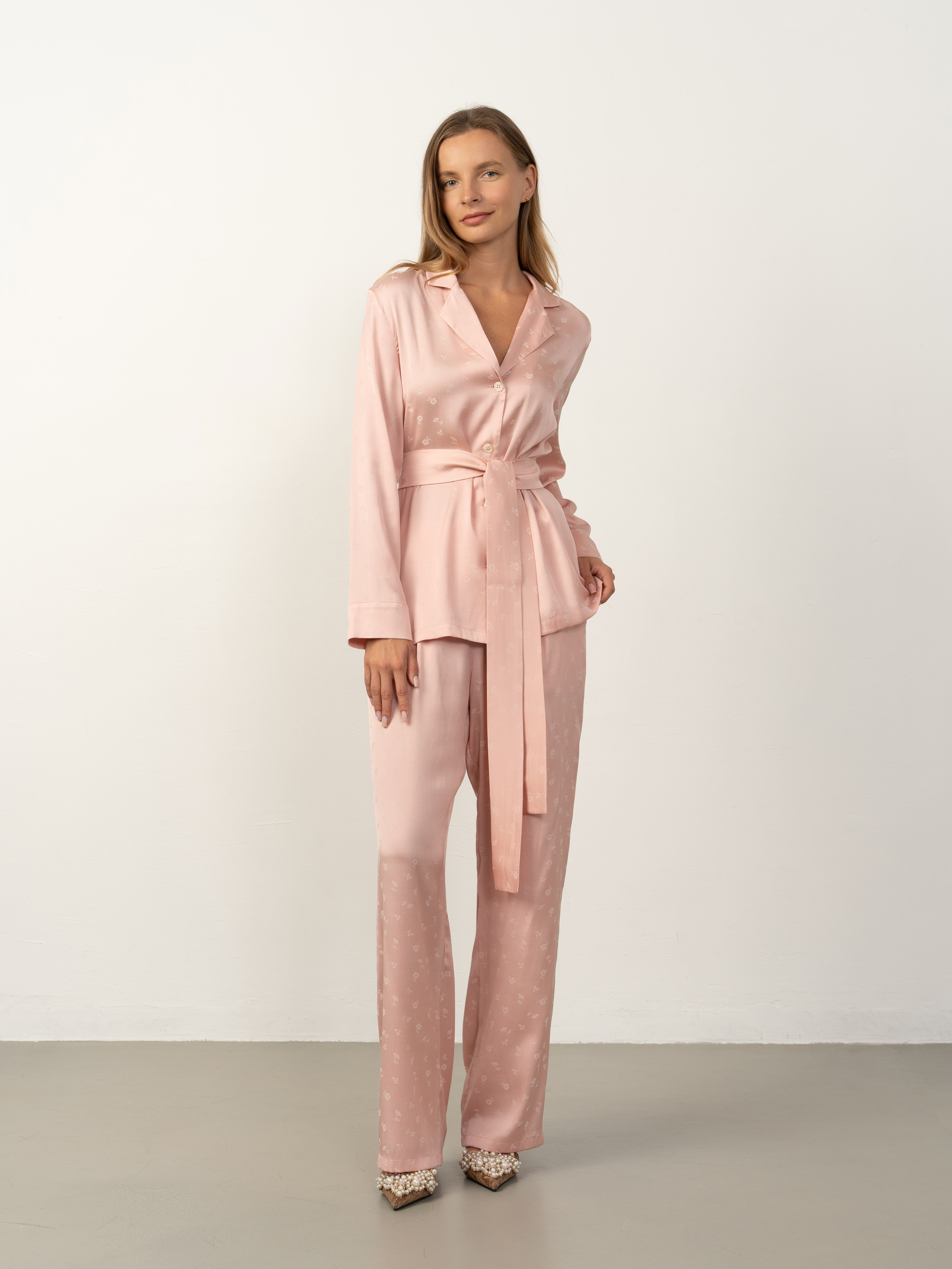 Комплект из жаккардовой вискозы с мелким цветочным принтом на нежно розовом фоне. Плательная ткань с сатиновым переплетением, с небольшим блеском. Визуально напоминает шелк. Легкая, хорошо драпируется, не электризуется, дышит. Рубашка свободного кроя на пуговицах, брюки прямого кроя с поясом и комфортной резинкой со стороны спинки. Сделано в России
