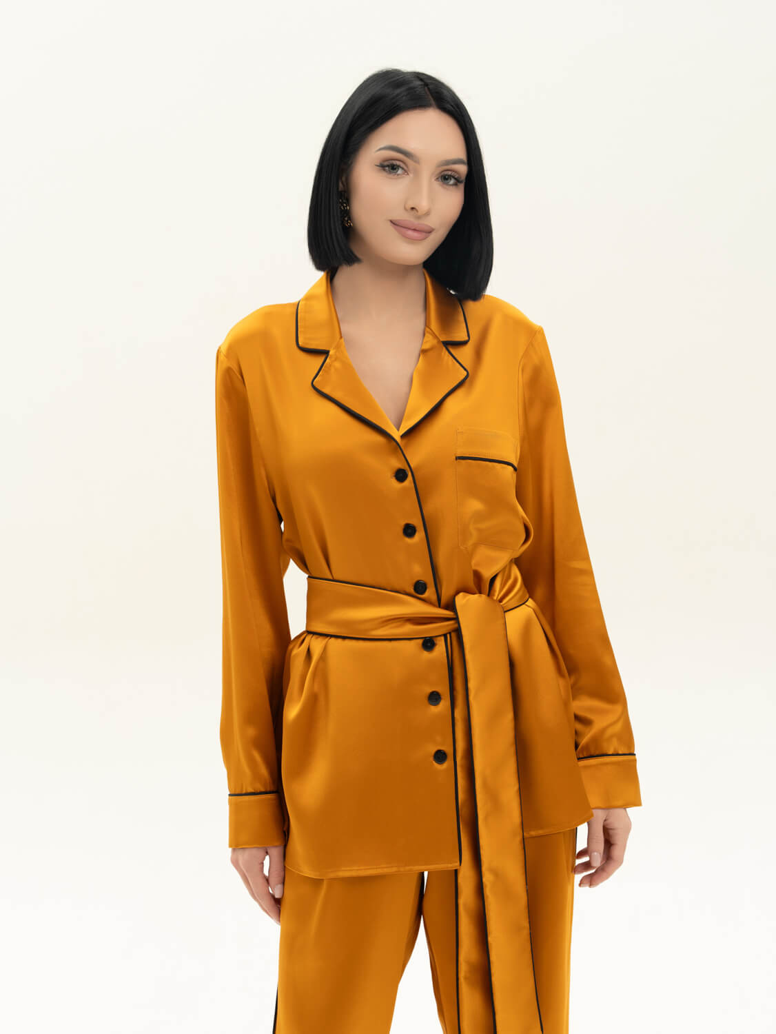 Пижамный комплект из премиальной коллекции Pijama Story Exclusive в янтарно-медовом оттенке. Рубашка свободного кроя с пуговицами. Брюки свободного кроя: спереди пояс, сзади резинка для комфорта движений не только дома, а и на отдыхе или вечеринке. Пижама выполнена с полностью закрытыми швами с изнаночной стороны ювелирным люксовым шитьем. Шелк Mulberry- ценнейший вид шелка, сотканный из тончайших нитей тутового шелкопряда. Обладает прочным плетением и гипоаллергенными свойствами. ШЕЛК - это ткань, которая заявляет о себе. Он красивый, элегантный и роскошный, невероятно мягкий и чувственный. Сделано в России. Параметры модели: рост 170, 85-62-87