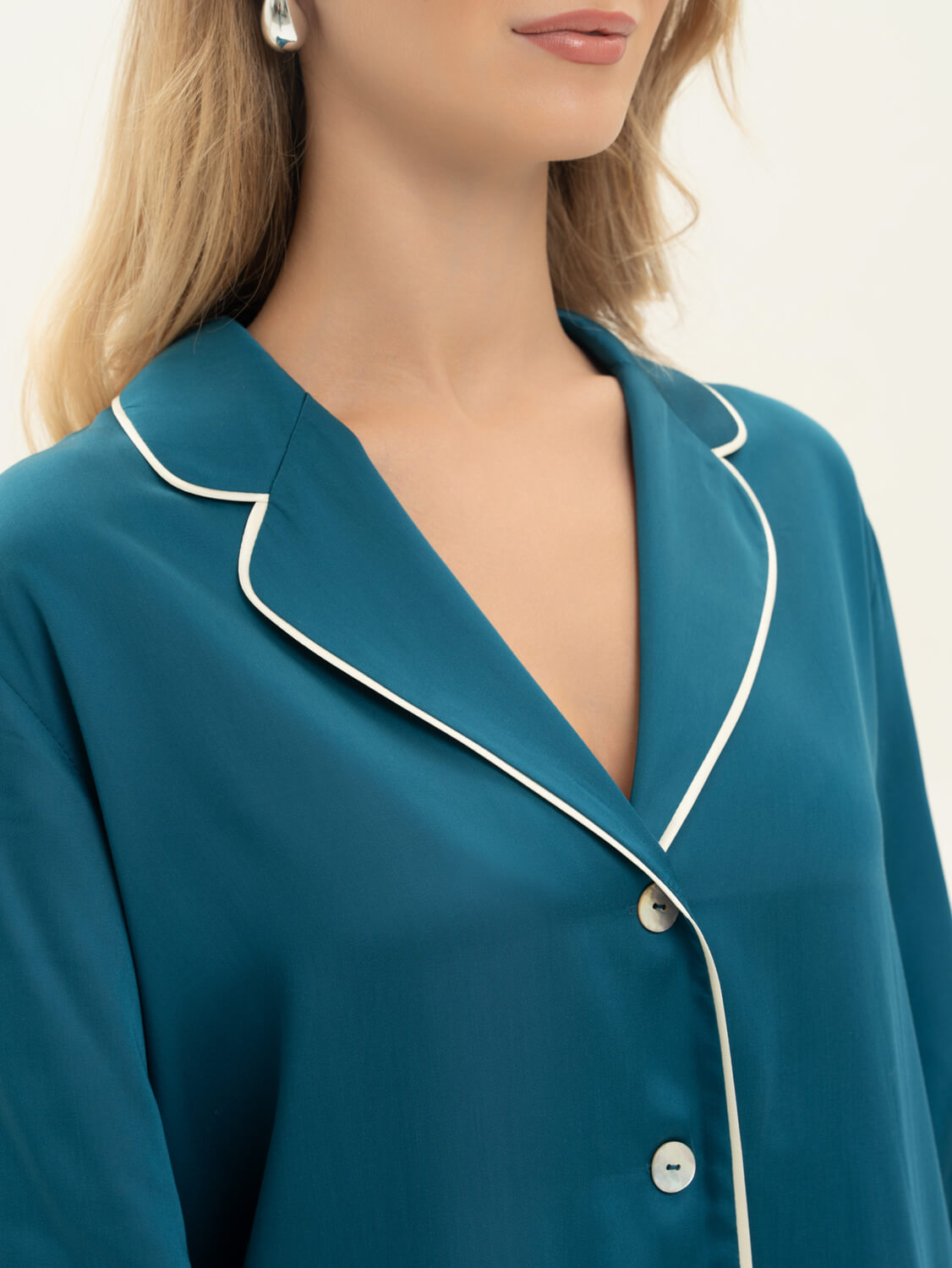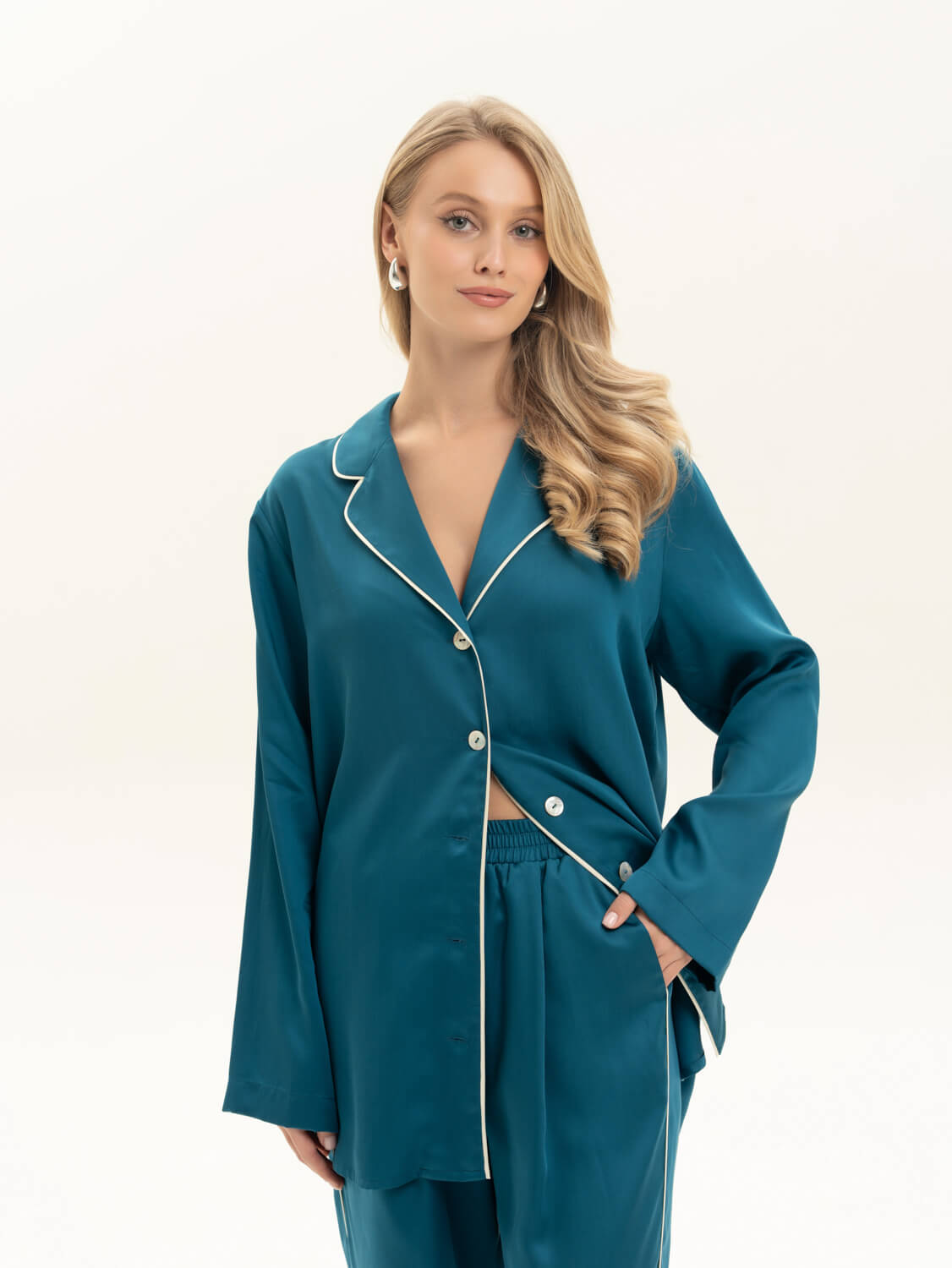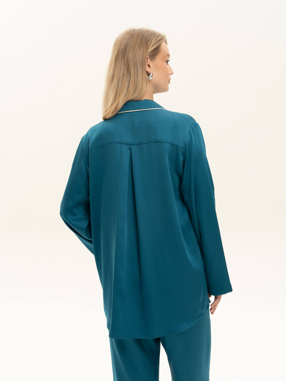 Комплект из 100% тенселя в изумрудном оттенке. Ткань нового поколения, вырабатывается из эвкалиптового волокна. Приятная на ощупь, гладкая и мягкая. Ткань обладает комфортными тактильными свойствами, мягко струится, не пиллингуется и не линяет. Костюм состоит из удлиненной рубашки, брюк с эластичным поясом и карманами.Сделано в России. Параметры модели: рост 175, 88-60-90