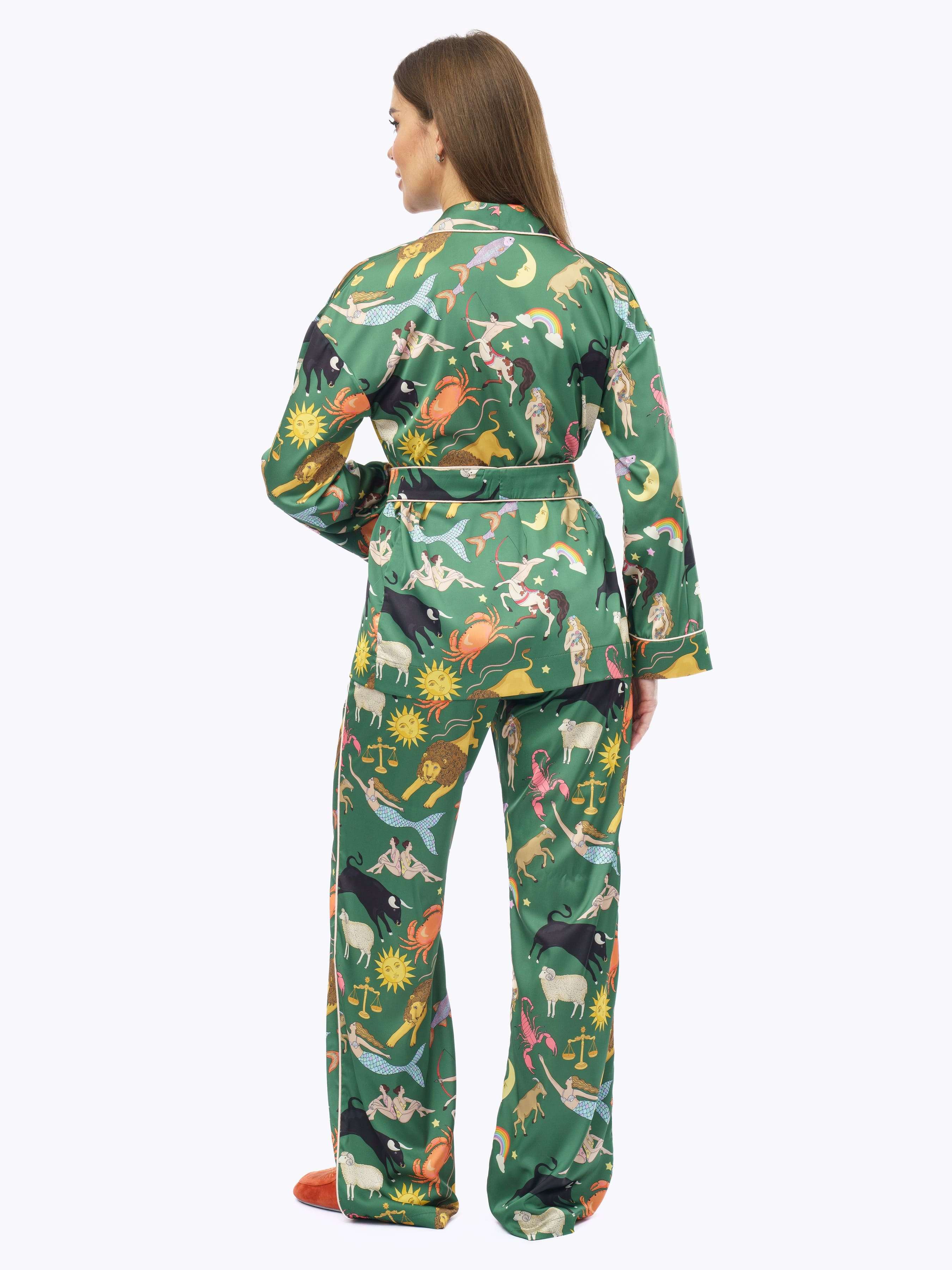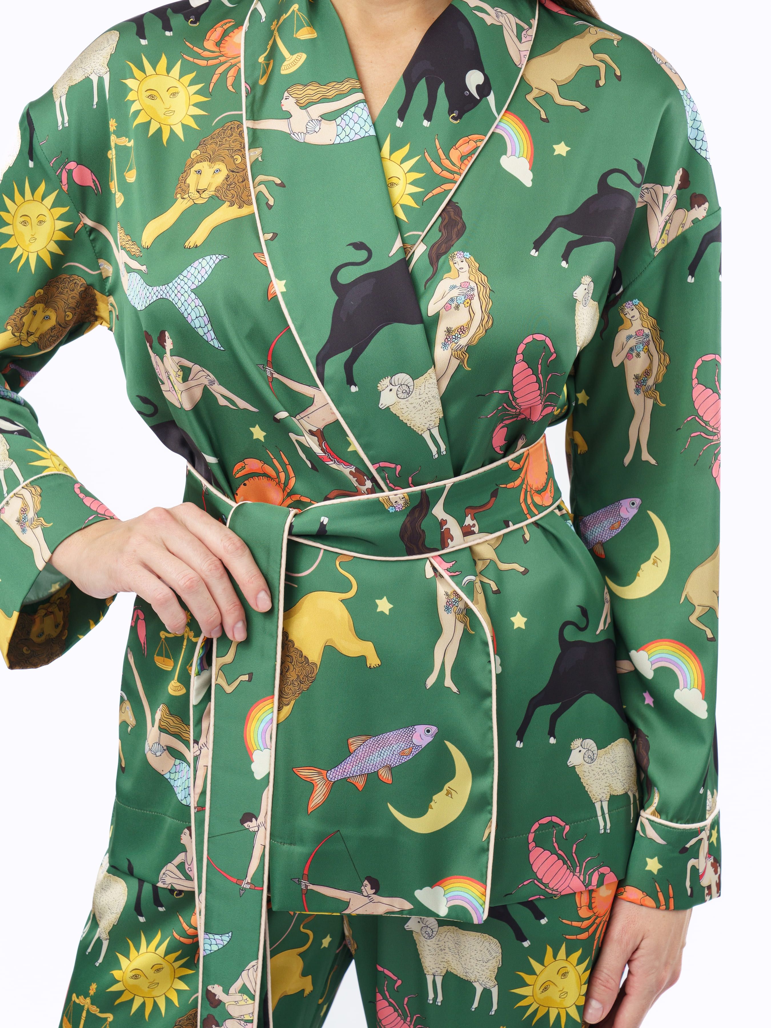 Комплект с принтом знаки зодиака выполнен в свободном крое, обеспечивая свободу движений , а закрытые внутренние швы дарят нежность прикосновений ткани к коже. Рубашка-кимоно с шалькой и завязками внутри подчеркивает женственность образа.