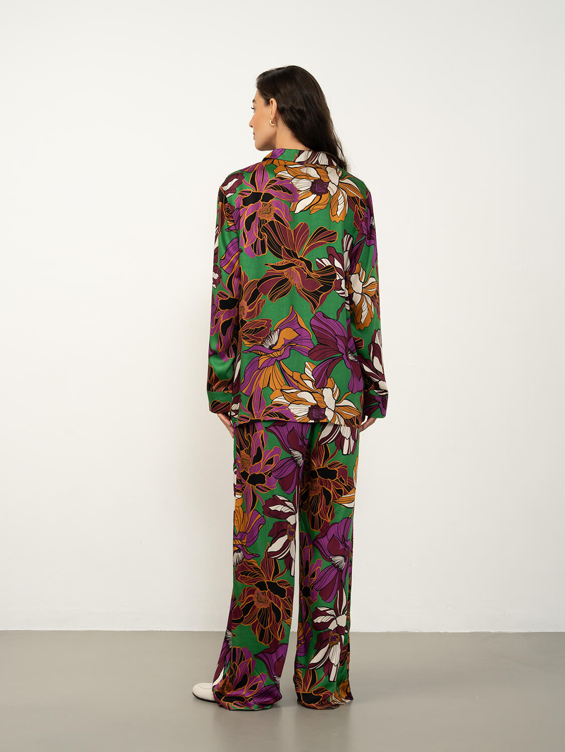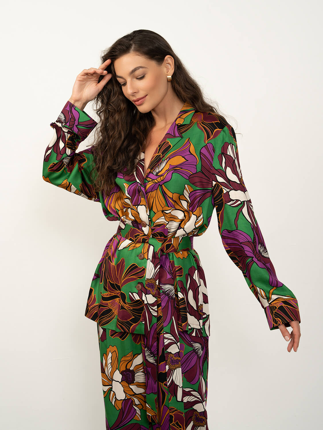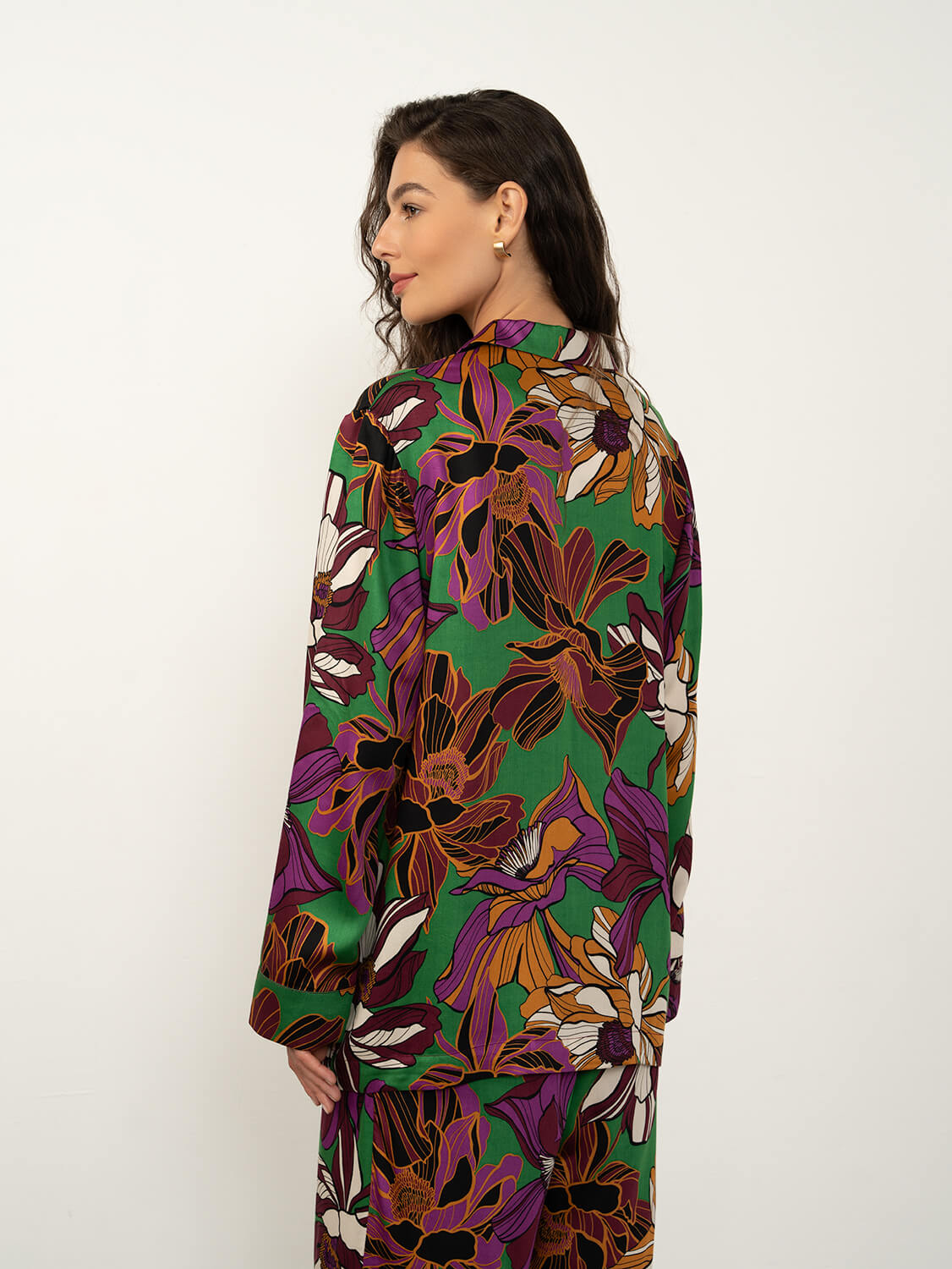 Пижамный костюм Simona выполнен из вискозы производства Италии. Цветовая гамма в сочетании с актуальными трендовыми оттенками - зеленый цвет яркой сочной травы и цветочно-растительный принт с фиолетовыми вставками вам подарит яркое настроение. Рубашка свободного кроя с отложенным воротником и пуговицами в цвет принта. Брюки классического кроя с защипами спереди под поясом и комфортной резинкой в талии со стороны спины, подарят полный комфорт в посадке. В таком пижамном костюме можно провести домашний вечер в кругу друзей или отправиться в путешествие, для прогулок по теплым улицам южных городов.