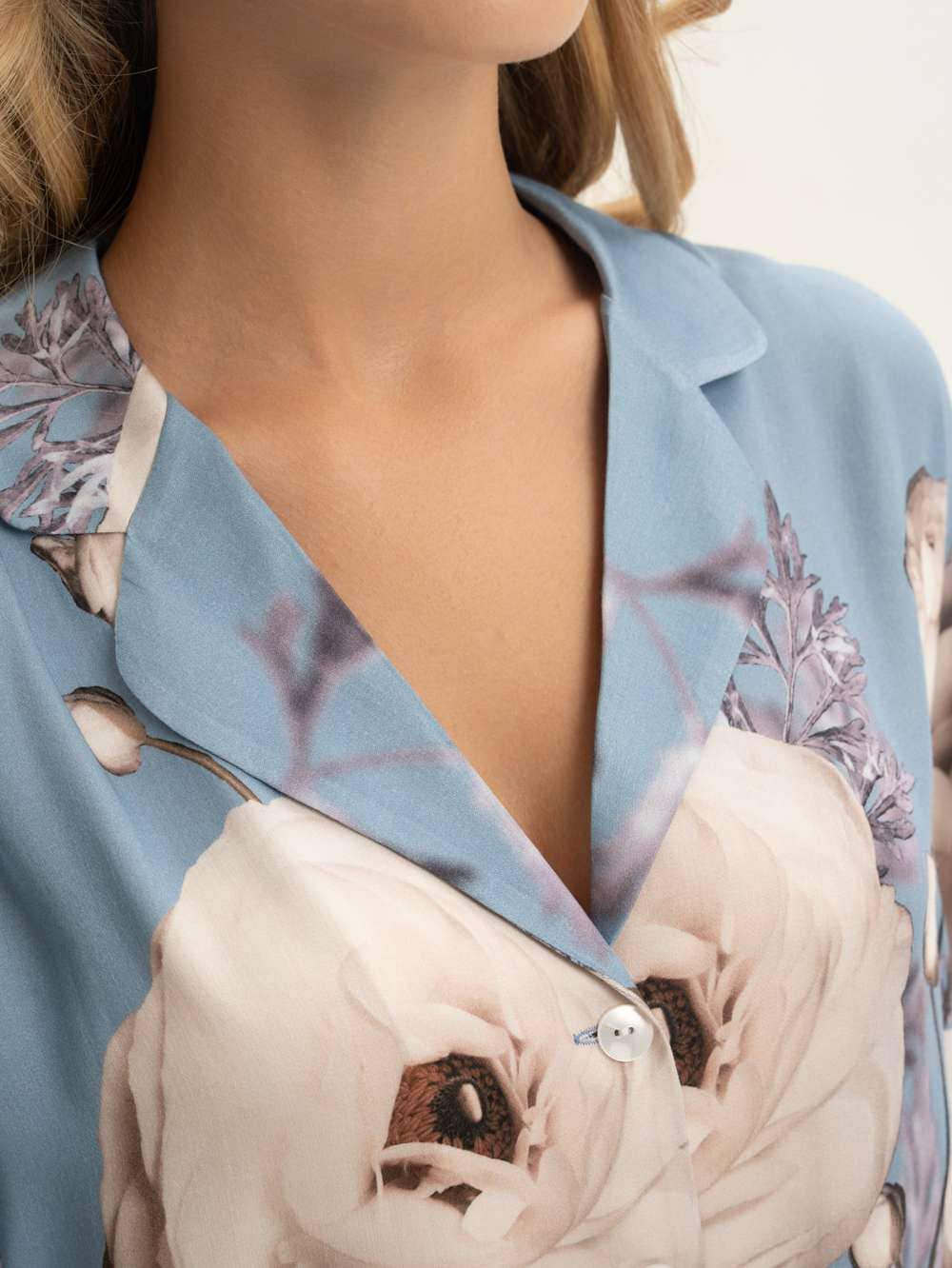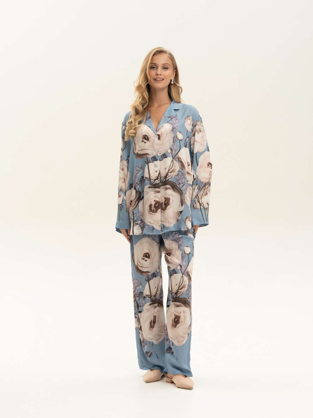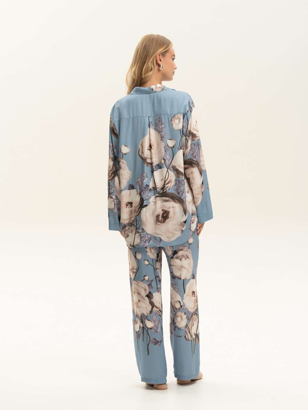 Костюм из невесомой итальянской вискозы в голубом оттенке с цветочным принтом. Брюки свободного кроя на эластичной резинке. Летящая рубашка с кокеткой и защипом на спине для еще большего кофорта в движении. СДелано в России. Параметры модели: рост 175, 88-60-90