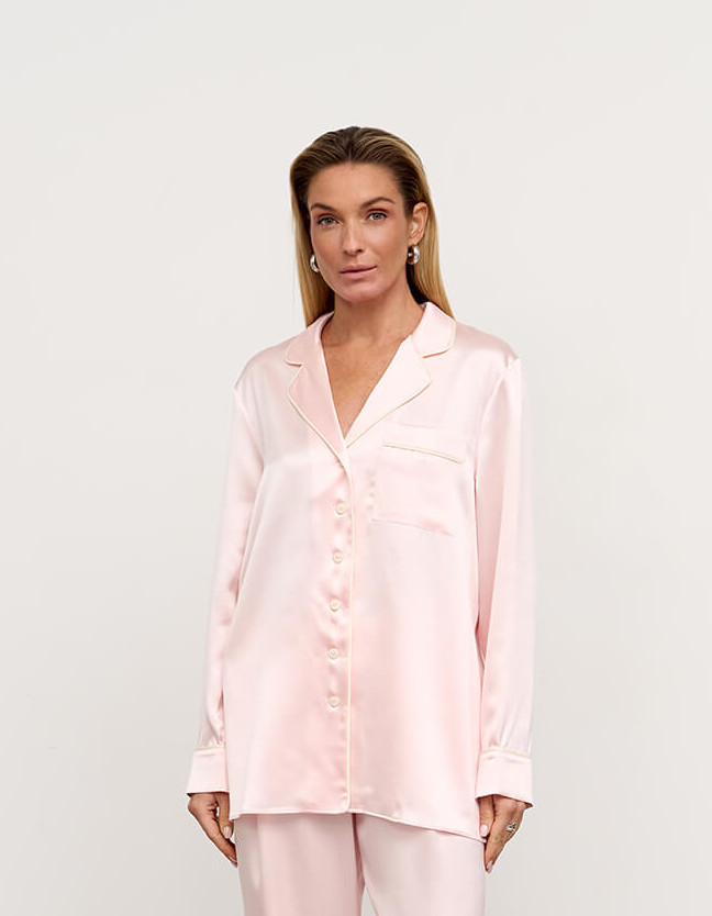 Пижамный комплект из премиальной коллекции Pijama Story Exclusive в нежно-розовом цвете. Рубашка свободного кроя с пуговицами. Кант светло-молочного оттенка по борту и на манжетах. Брюки свободного кроя: спереди пояс, сзади резинка для комфорта движений не только дома, а и на отдыхе или вечеринке. Пижама выполнена с полностью закрытыми швами с изнаночной стороны ювелирным люксовым шитьем. Шелк Mulberry- ценнейший вид шелка, сотканный из тончайших нитей тутового шелкопряда. Обладает прочным плетением и гипоаллергенными свойствами. ШЕЛК - это ткань, которая заявляет о себе. Он красивый, элегантный и роскошный, невероятно мягкий и чувственный. Сделано в России. Параметры модели: 85/63/94. Рост 176 см.