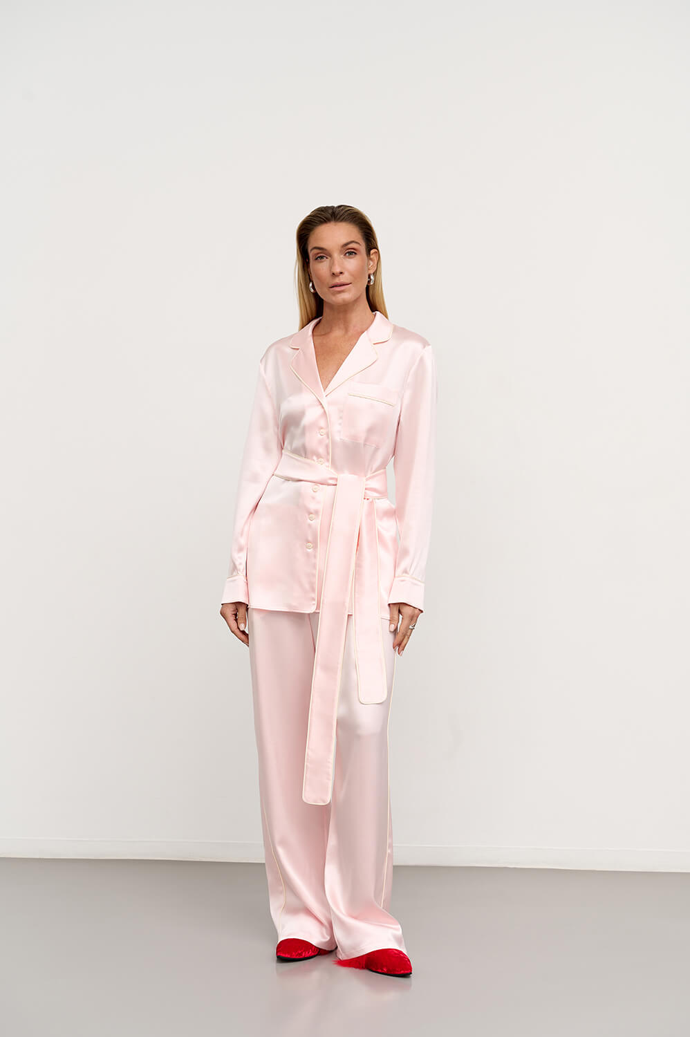 Пижамный комплект из премиальной коллекции Pijama Story Exclusive в нежно-розовом цвете. Рубашка свободного кроя с пуговицами. Кант светло-молочного оттенка по борту и на манжетах. Брюки свободного кроя: спереди пояс, сзади резинка для комфорта движений не только дома, а и на отдыхе или вечеринке. Пижама выполнена с полностью закрытыми швами с изнаночной стороны ювелирным люксовым шитьем. Шелк Mulberry- ценнейший вид шелка, сотканный из тончайших нитей тутового шелкопряда. Обладает прочным плетением и гипоаллергенными свойствами. ШЕЛК - это ткань, которая заявляет о себе. Он красивый, элегантный и роскошный, невероятно мягкий и чувственный. Сделано в России. Параметры модели: 85/63/94. Рост 176 см.