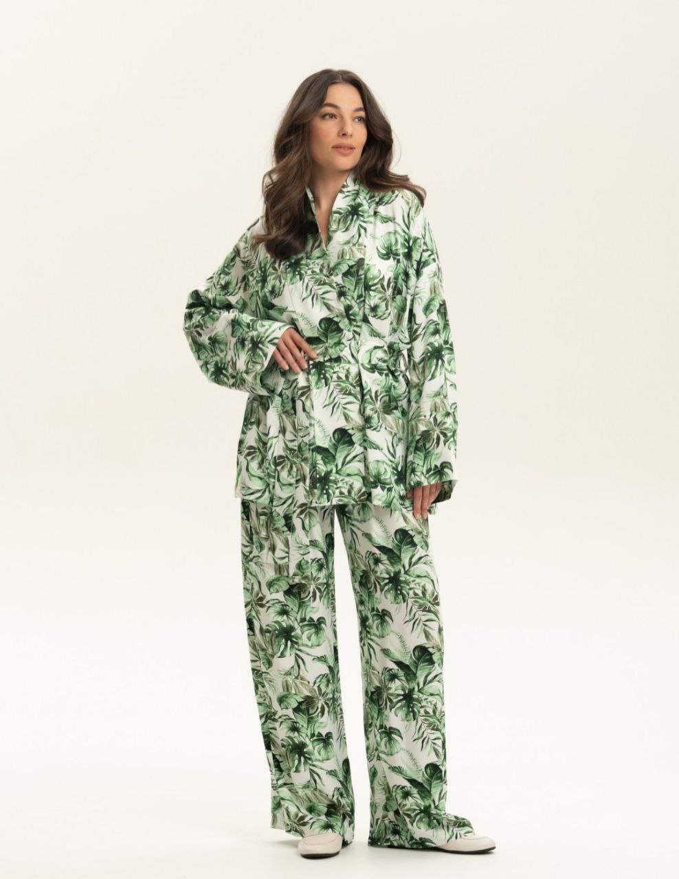 Костюм в пижамном стиле Summer in Hawaii выполнен из мягкой и приятной к телу вискозы. Ткань матовая, средней плотности. Ботанические мотивы в зеленом градиенте на основном белом фоне мысленно отправляют нас в тропическую прогулку к папортникам и пальмам. Принт освежает и добавляет легкости образу. Костюм отшит со свободными брюками с карманами и эластичной резинкой в талии. Кимоно имеет широкий манжет и борт, обрамленные белым кантом, что добавляет изысканности образу. Внутри кимоно завязки, снаружи широкий пояс. Сделано в России. Параметры модели : Параметры модели: рост 176 см, объем груди 85 см, талии 63 см, бедер 94 см