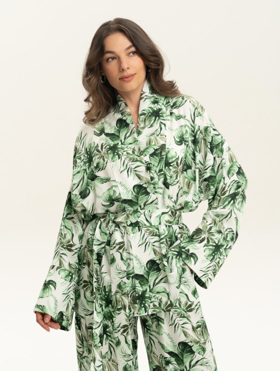 Костюм в пижамном стиле Summer in Hawaii выполнен из мягкой и приятной к телу вискозы. Ткань матовая, средней плотности. Ботанические мотивы в зеленом градиенте на основном белом фоне мысленно отправляют нас в тропическую прогулку к папортникам и пальмам. Принт освежает и добавляет легкости образу. Костюм отшит со свободными брюками с карманами и эластичной резинкой в талии. Кимоно имеет широкий манжет и борт, обрамленные белым кантом, что добавляет изысканности образу. Внутри кимоно завязки, снаружи широкий пояс. Сделано в России. Параметры модели : Параметры модели: рост 176 см, объем груди 85 см, талии 63 см, бедер 94 см